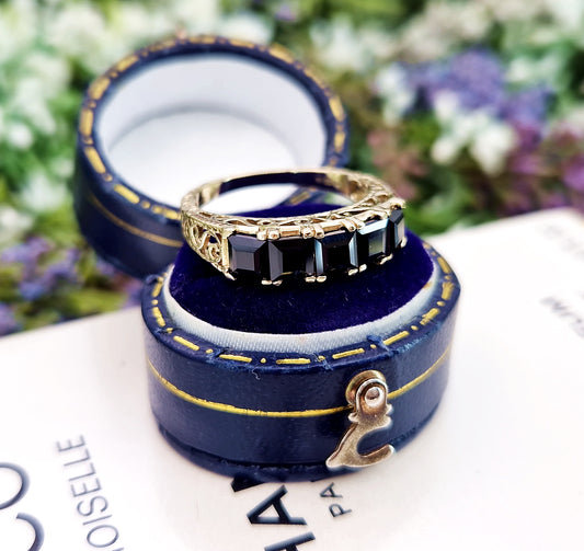 Vintage 9ct Yellow Gold Ornate Dark Sapphire Gemstone Statement Ring / Size P 1/2 or 8.25