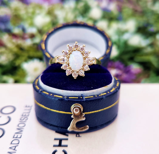 Vintage 9ct Yellow Gold Fancy Opal and Crystal Cluster Ring / Size O 1/2 or 7.75