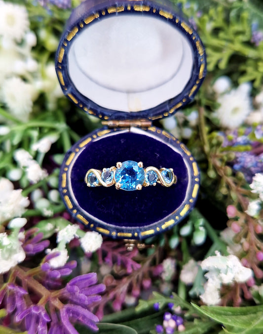 Vintage 9ct Yellow Gold Blue Topaz 5 Stone Wave Ring / Size P 1/2 or 8.25