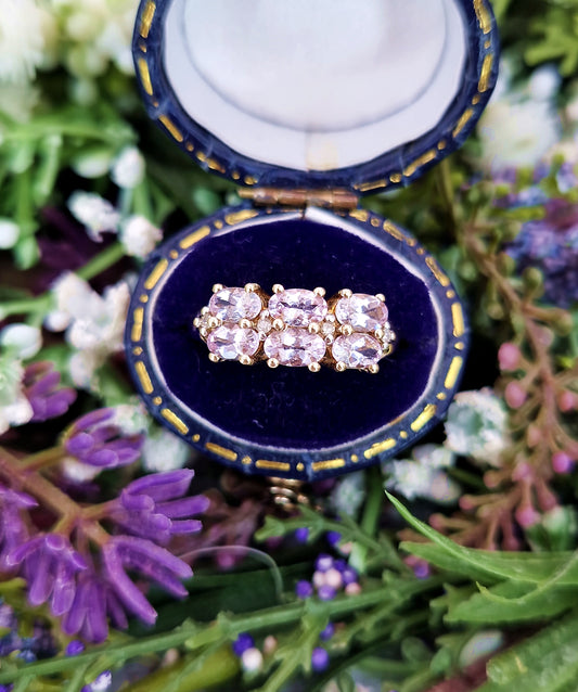 Vintage 9ct Yellow Gold Pink Topaz and Diamond Cluster Statement Ring / Size O or 7.5