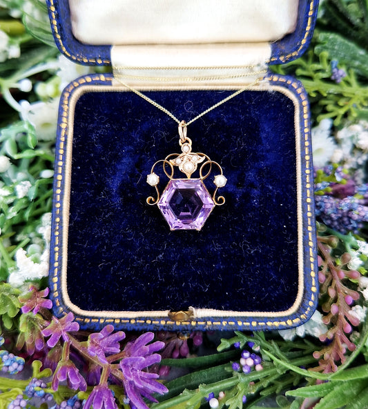 Antique Art Nouveau 9ct Gold Purple Amethyst and Pearl Hexagon Pendant Necklace