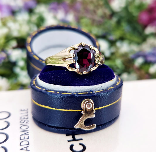 Vintage 9ct Yellow Gold Rich Garnet Gemstone Solitaire Ring / Size T 1/2 or 10.25