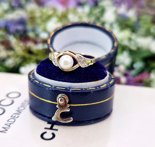 Vintage 9ct Yellow Gold Dainty Pearl and Diamond Ring / Size K 1/2 or 5.75