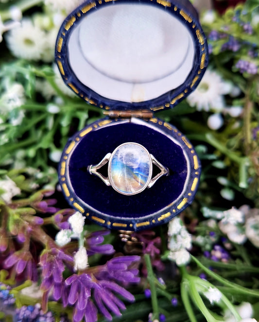 Vintage Sterling Silver Colourful Oval Moonstone Cabochon Ring / Size N or 7