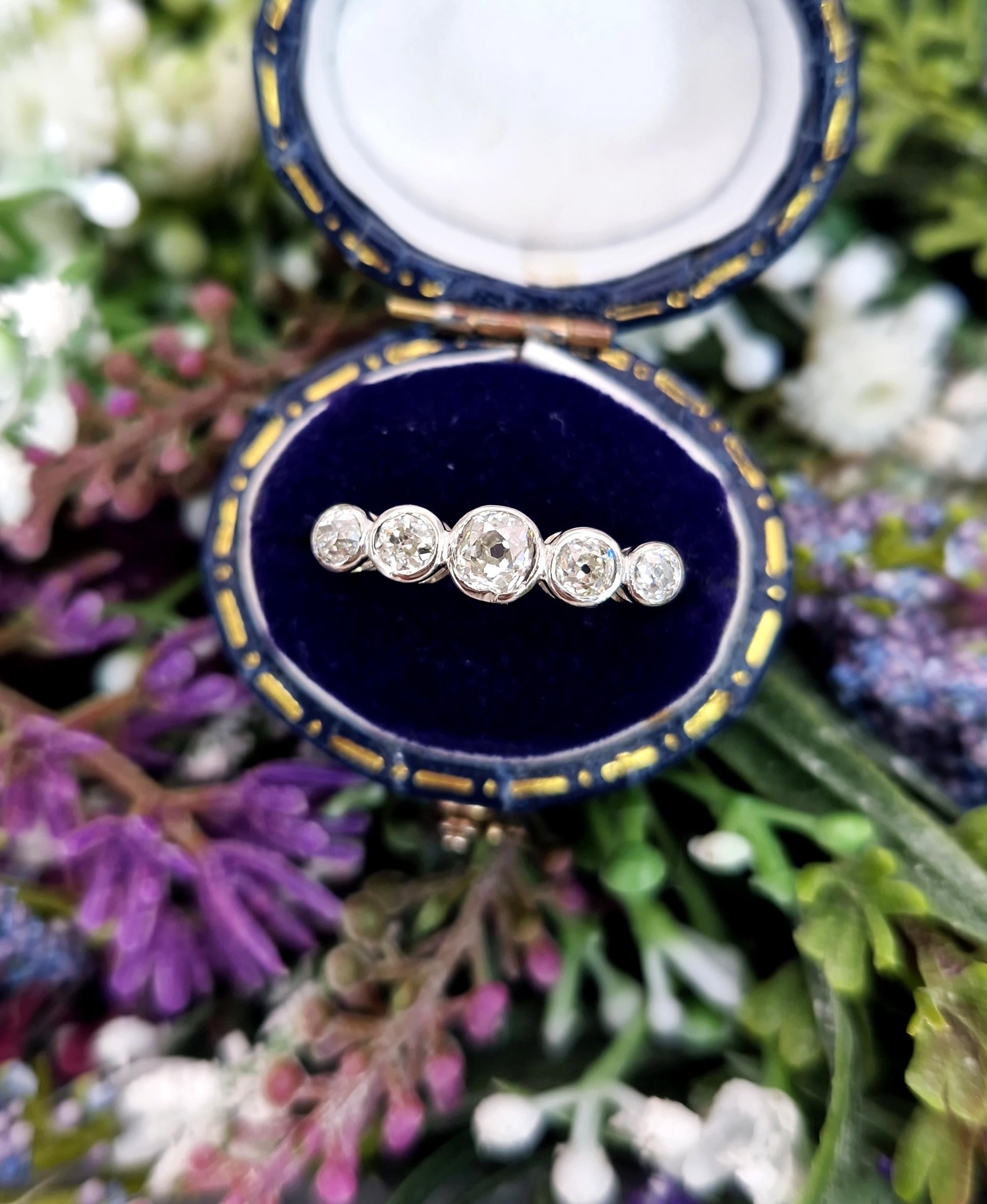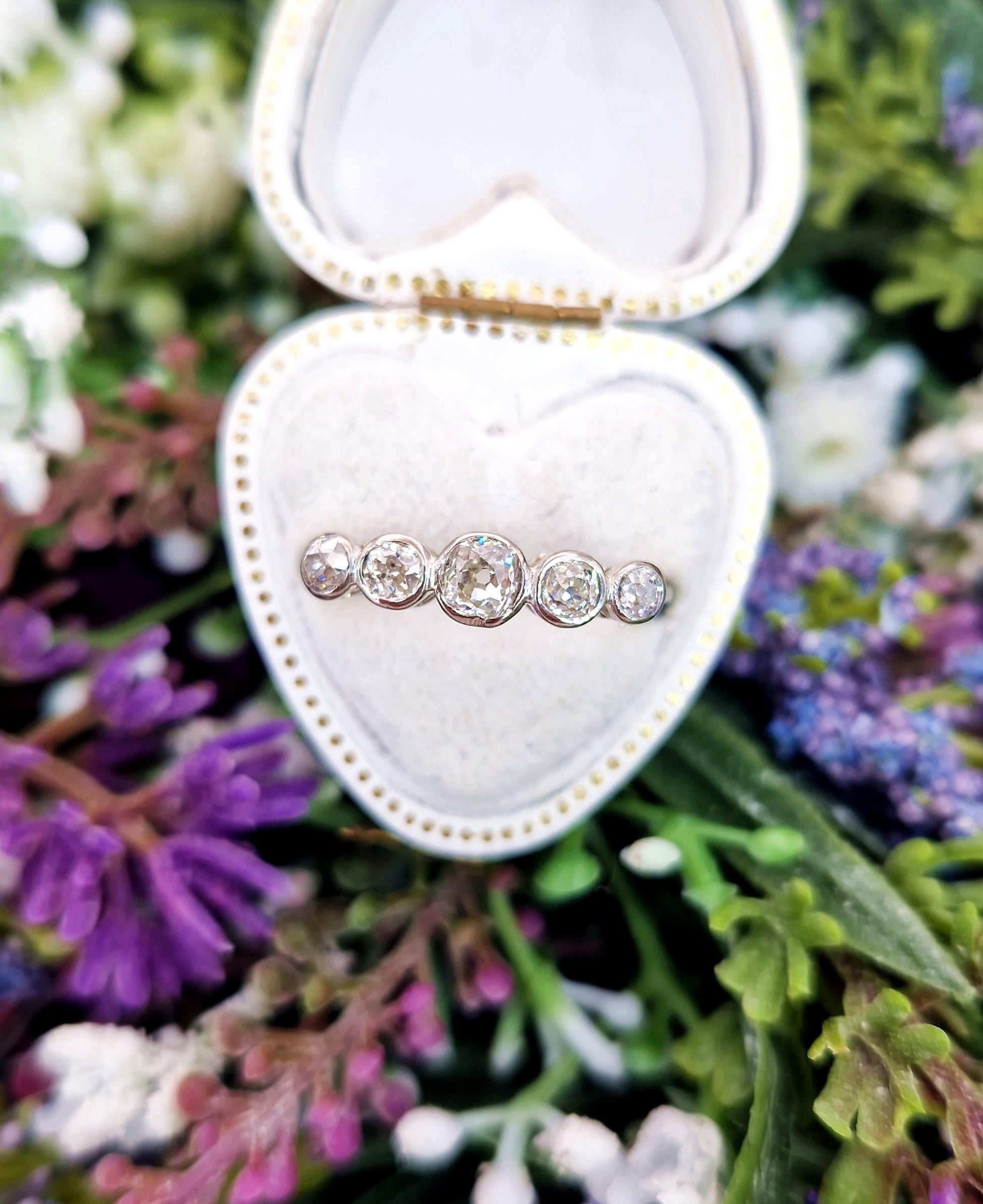 These diamonds are gorgeous antique examples. They are super sparkly, especially in low light (they were cut at a time where candle light was common). They do have tiny natural inclusions, though the inclusions are primarly white/clear (there is just one tiny black caron inclusion in one of the middle diamonds), so they are not distracting. The colour is very good for all 5, with all of the diamonds showing up as mostly white.