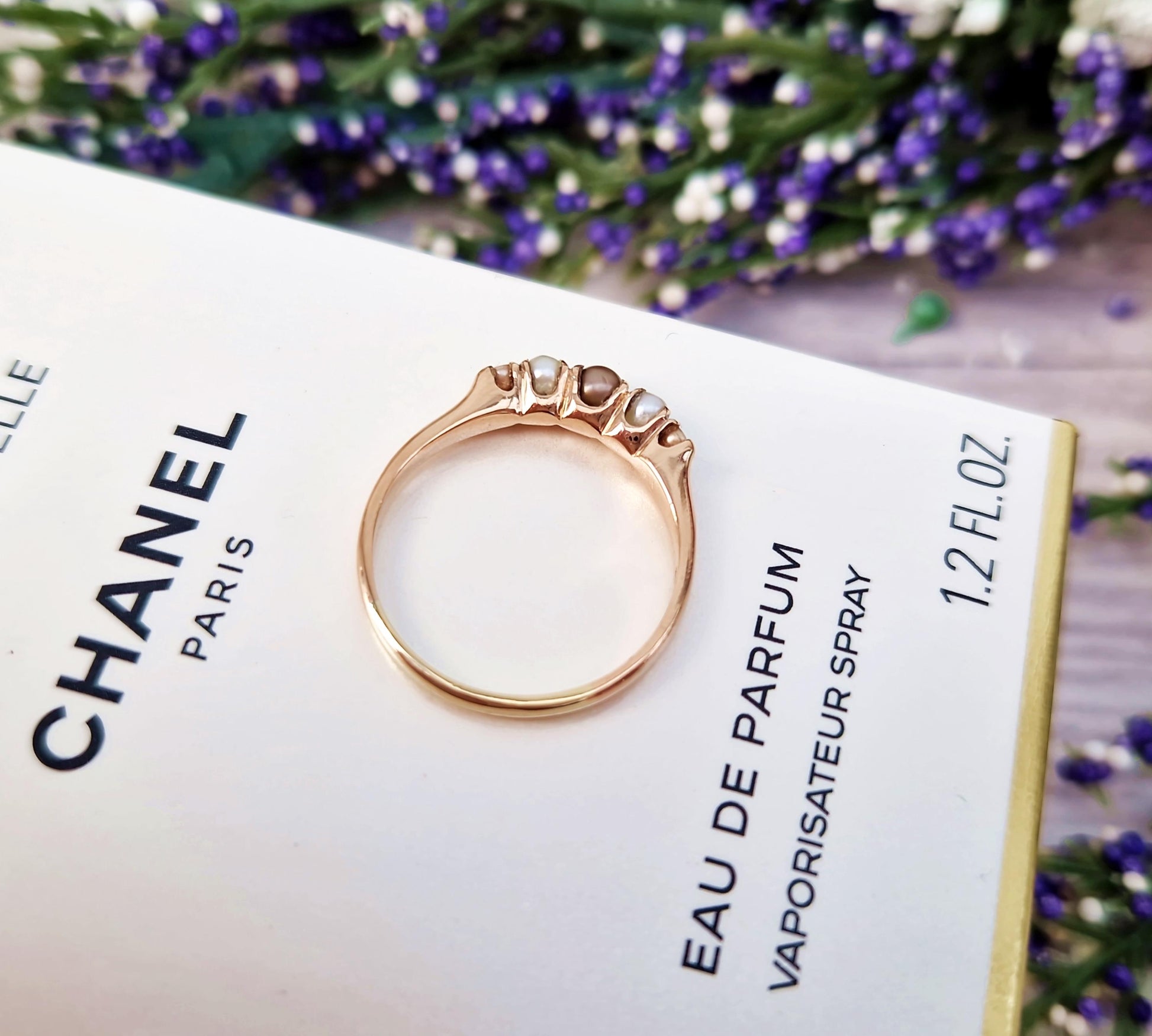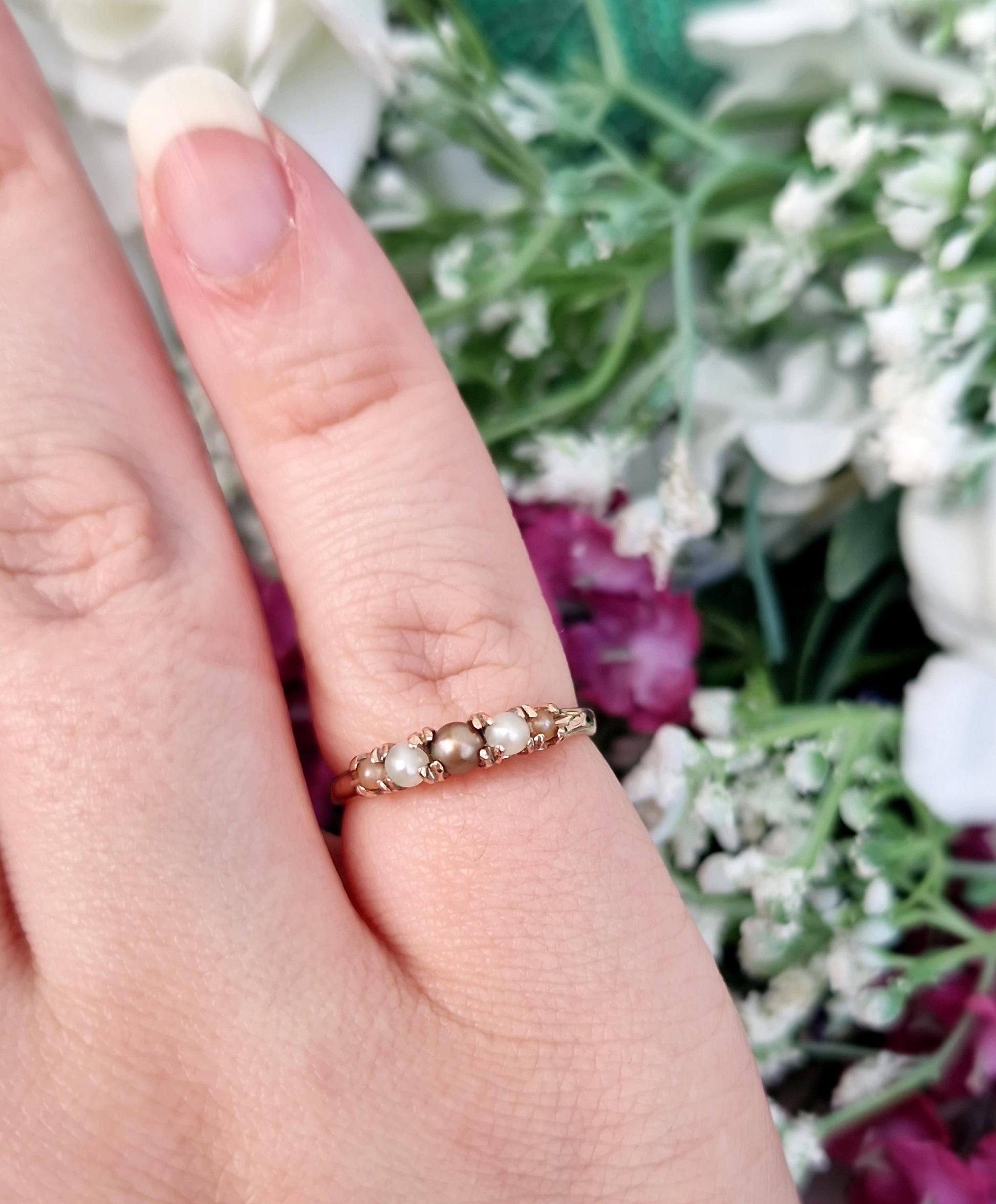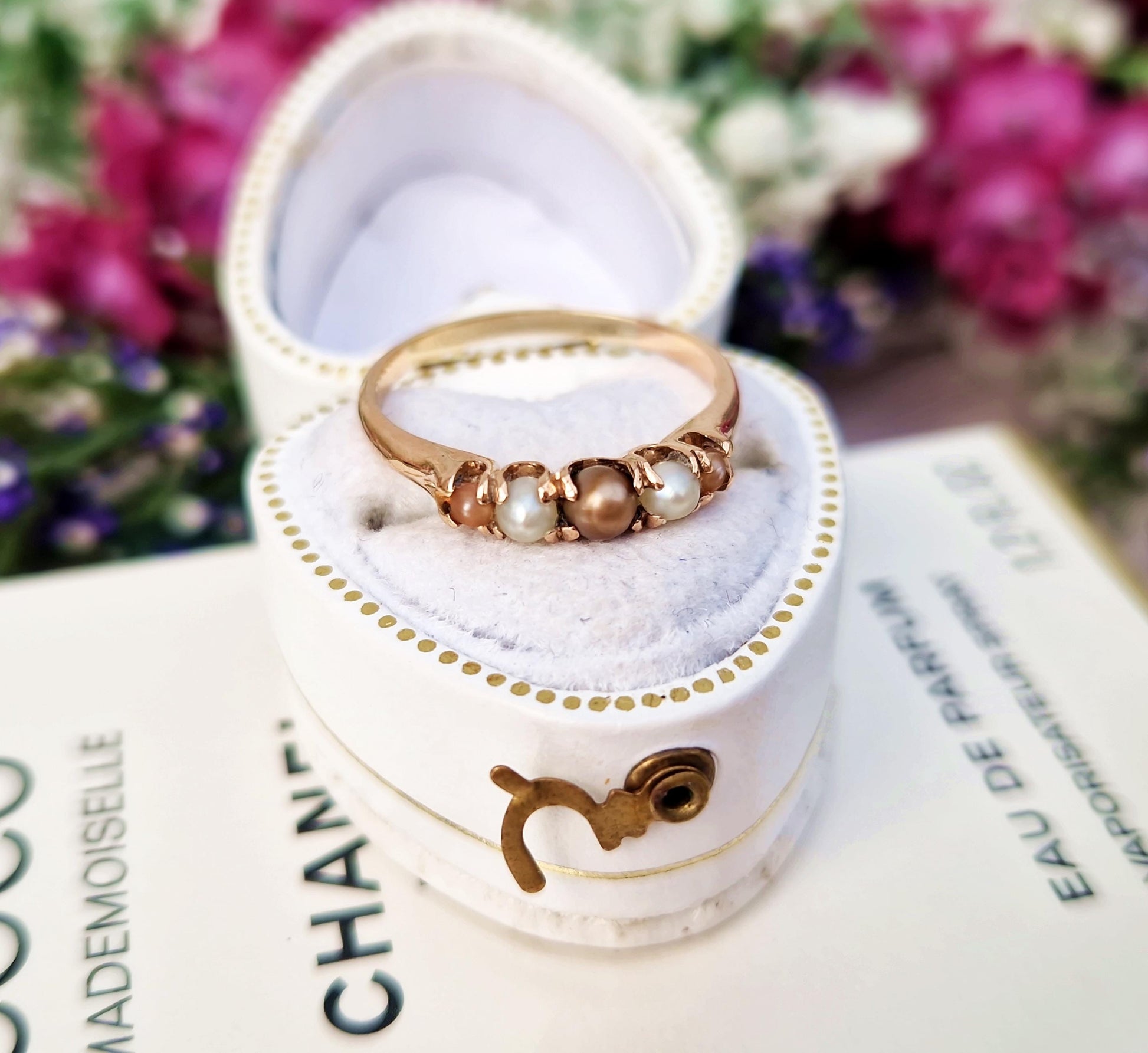 This amazing antique ring is in crafted in 14ct gold and holds 5 beautiful natural pearls. The pearls shine in varieties of chocolate, white and champagne tones - a very unique and attractive combination. They are mounted within fine prongs. This ring is dainty and very feminine, it would be perfect added to a ring stack.
