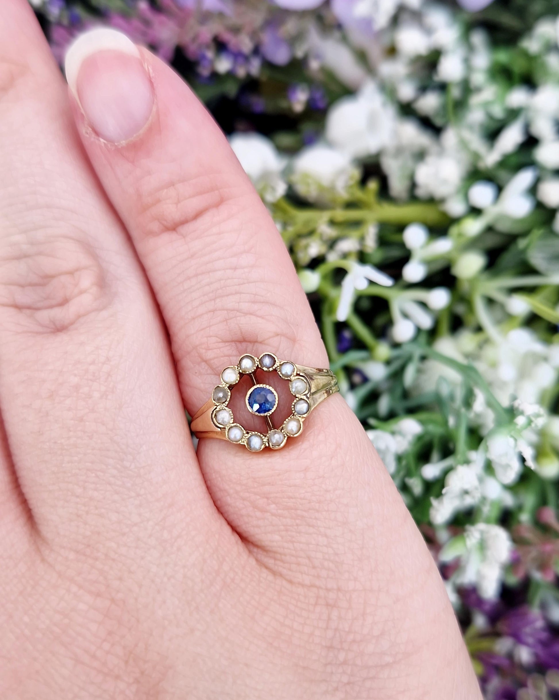 This is a beautiful and unusual antique Art Deco ring, made circa 1920. Made of solid 15ct yellow gold. The face of the ring is round in shape and is a popular 'target' design. It features a stunning royal blue sapphire suspended in the middle. Surrounding the sapphire is a halo of small natural seed pearls. These lovely old little pearls still have excellent lustre, and they truly show their natural qualities in the varience of colours they display - from a steely darker grey, to a shimmering silver, to a snow like white. The design as a whole is so very pretty, classic yet unique. The edge of the ring face and stone settings are finished with a delicate milgrain detailing. With wide, attractive split shoulder detailing.