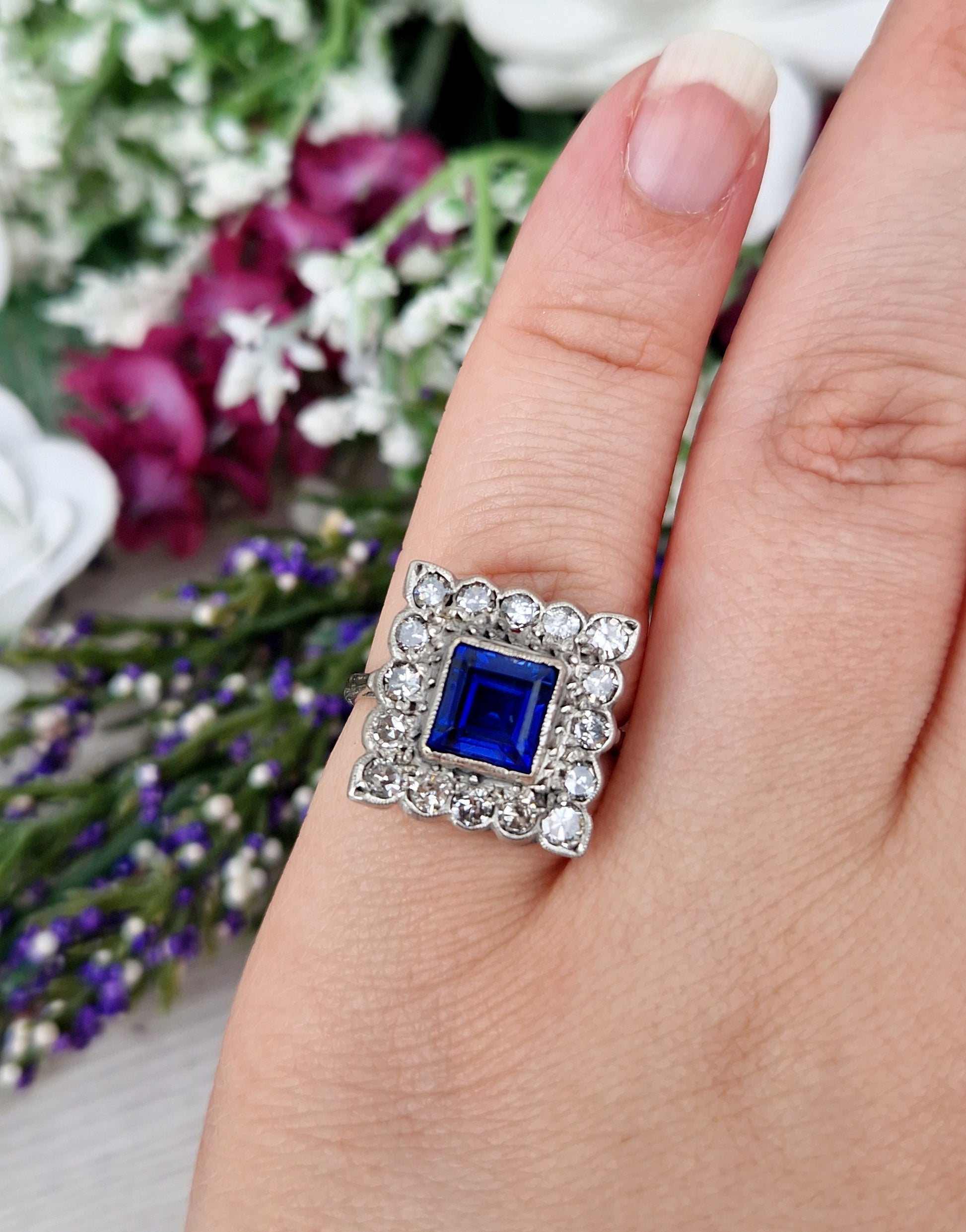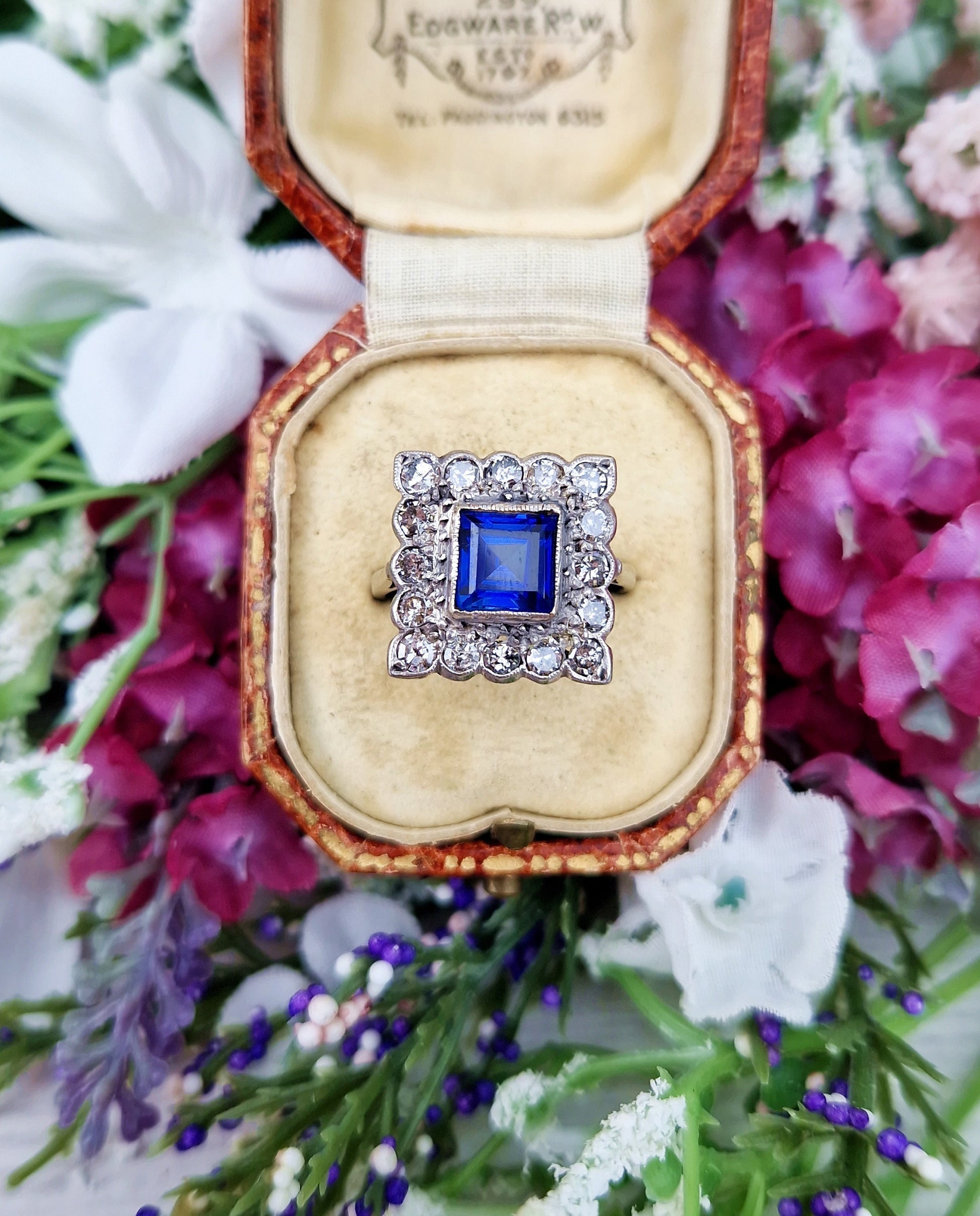 A stunning solid 18ct white gold antique cluster ring. This incredible ring was made in the Art Deco era, circa 1920. This amazing ring holds a vibrant square cut blue sapphire in the middle, which is surrounded by a halo of large sparkling diamonds. The colour of this sapphire is truly stunning, it is the most perfect vibrant royal blue. Boasting 16 natural round cut diamonds surrounding it, totalling over 1.2cts in weight, in a fluted edge cluster mount with milgrain edge details. This showstopping ring makes an impact on the hand and can be seen from across a room! She's the definition of a head turner.