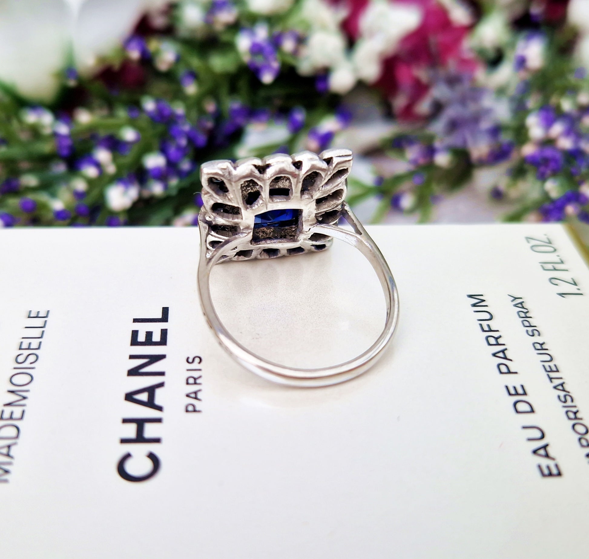 Gemstones: 1x (7 x 7 mm, approximately 1.96cts) square cut sapphire. We have tested this stone with a Presidium Gemstone Tester and have verified it as a real sapphire. We presume it is an early example of a lab created sapphire - rather than a natural grown sapphire. A lab-created sapphire has the exact chemical composition as a natural sapphire harvested from a traditional mine. Lab grown gemstones are typically perfect examples, with excellent clarity and colour.