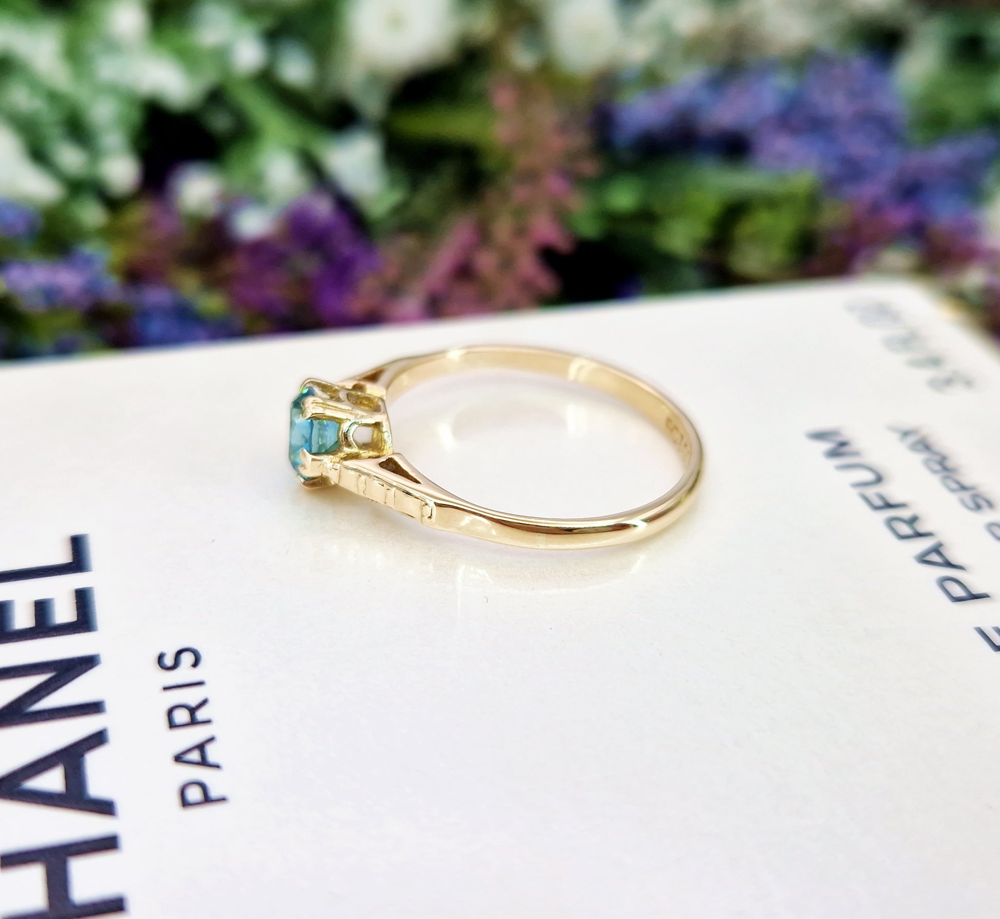 Antique Art Deco 9ct Yellow Gold Blue Zircon Gemstone Solitaire Ring / Size O 1/2 or 7.75