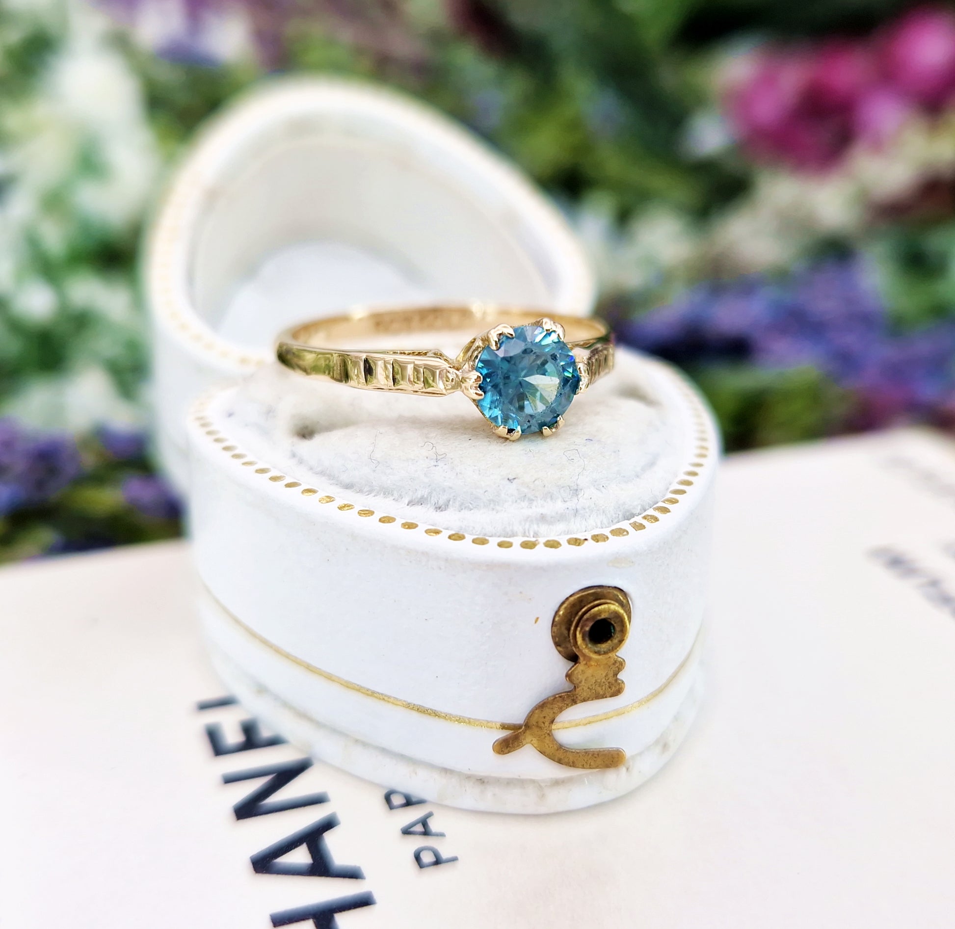 A beautiful solid 9ct yellow gold original Art Deco era ring, circa 1920. This stunning solitaire design features a blue zircon gemstone, this zircon is a vibrant saturated sky blue, and it sparkles amazingly. The zircon is held within 6 dainty spilt prongs, with a classic raised gallery and etched detailing on the shoulders, which is a perfect subtle decorative detail.