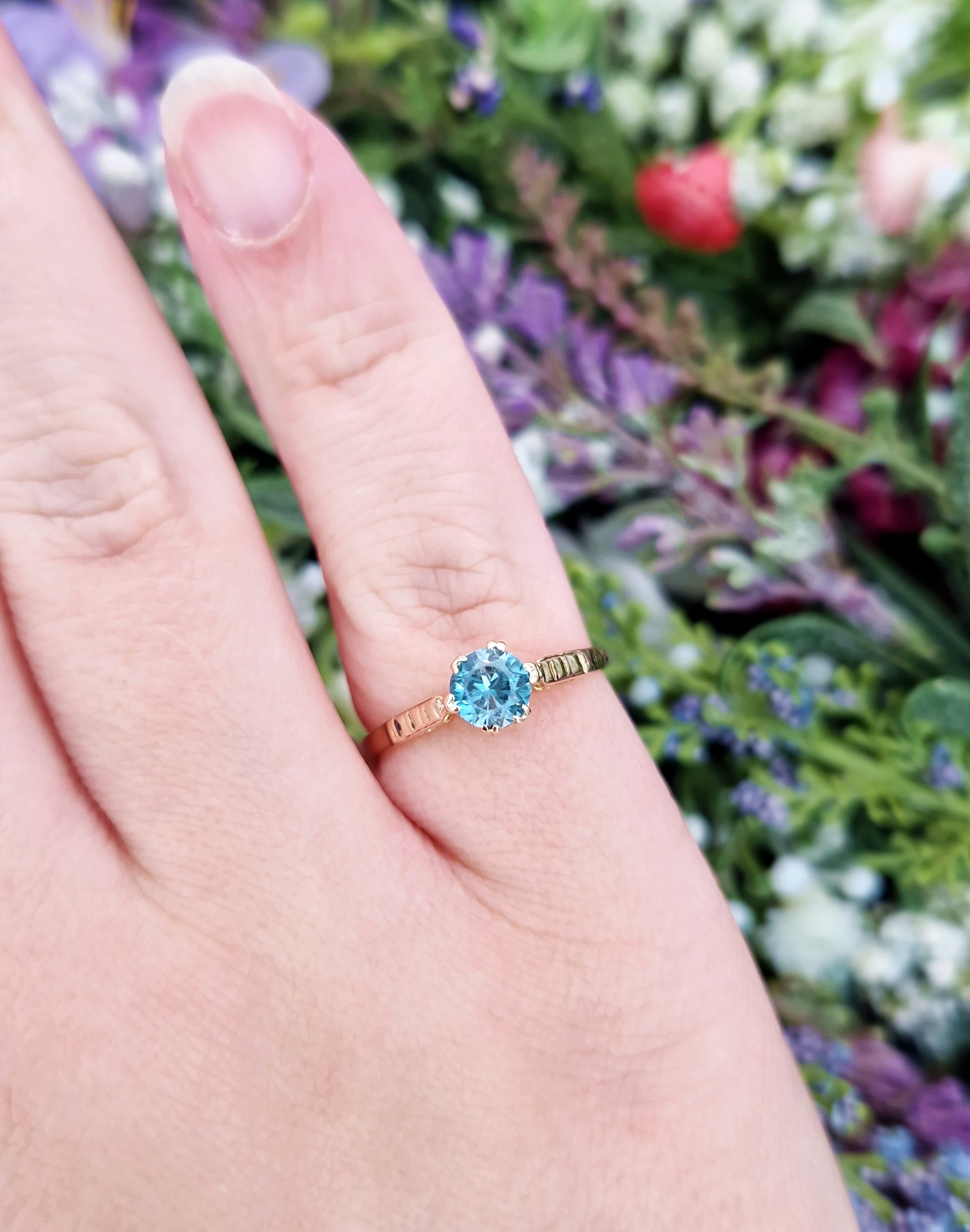 Gemstones: 1x (5.5mm) round cut blue zircon (approximately 0.66cts)