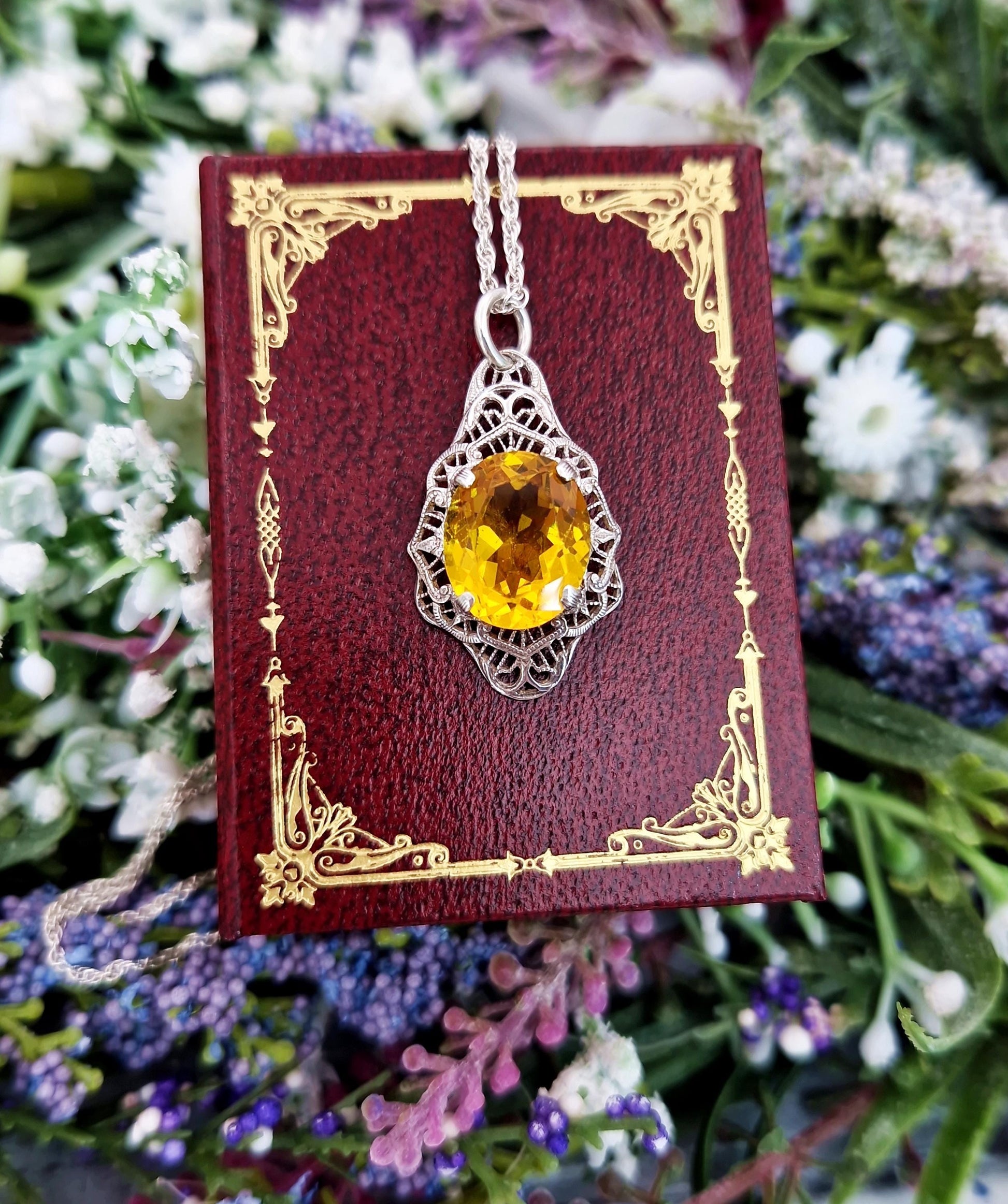 This lovely antique pendant necklace is so ornate, it is made of solid sterling silver. The pendant was made circa 1925, the Art Deco era. The design is a beautiful geometric shield and is highly ornate with lots of open work detail. The stone is a vibrant sunshine yellow coloured paste glass, it truly glows and looks magnificent within the setting - it's a fantastic ethical rival for any gemstone, for a more affordable price point.