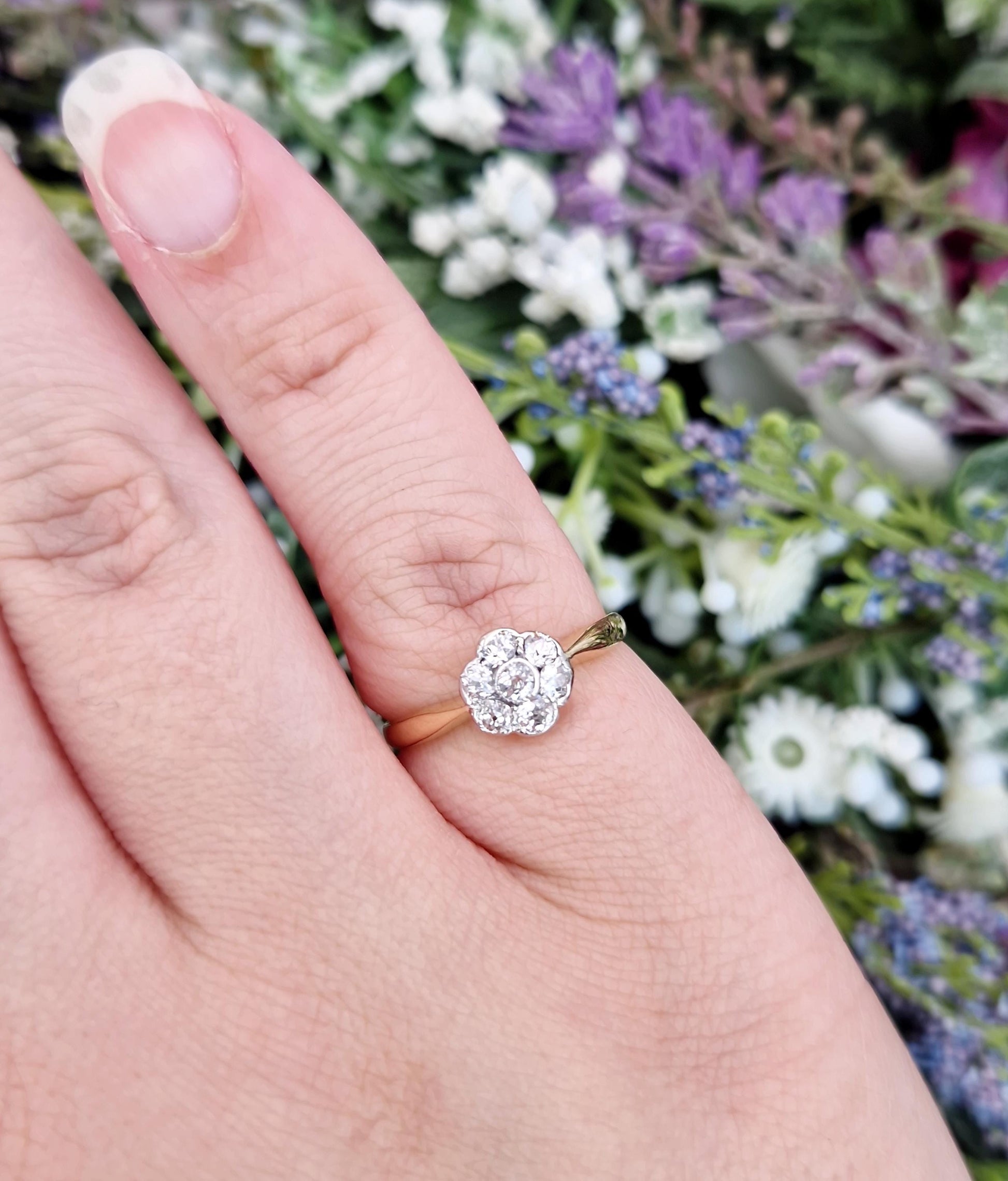 Antique Edwardian 18ct Gold Natural Diamond Daisy Cluster Engagement Ring 0.34cts / Size M 1/2 or 6.75