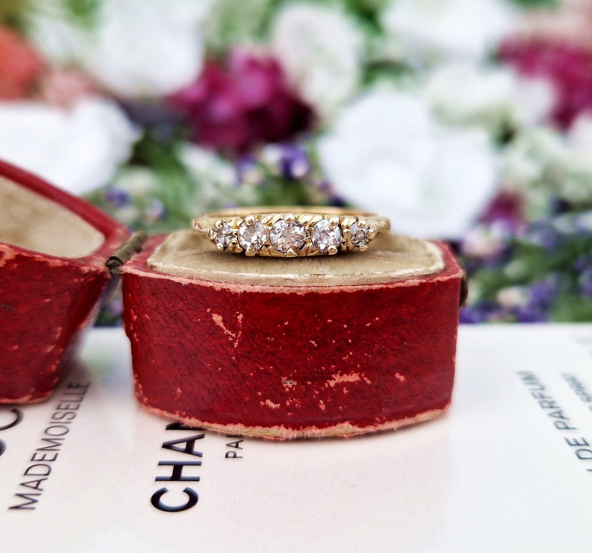 A beautiful solid 18ct yellow gold antique ring, an original antique Edwardian era piece circa 1910. An elegant band ring with ornate deep carved scrolling gallery details, this ring is stunning from every angle and no attention to detail has been missed. Set with 5 old European cut diamonds in graduating sizes, the diamonds spread right across the finger for maximum sparkle. A heirloom worthy piece of antique jewellery, and a jewellery box staple. This band can be easily stacked, or worn alone, or would also make a gorgeous engagement or wedding ring.