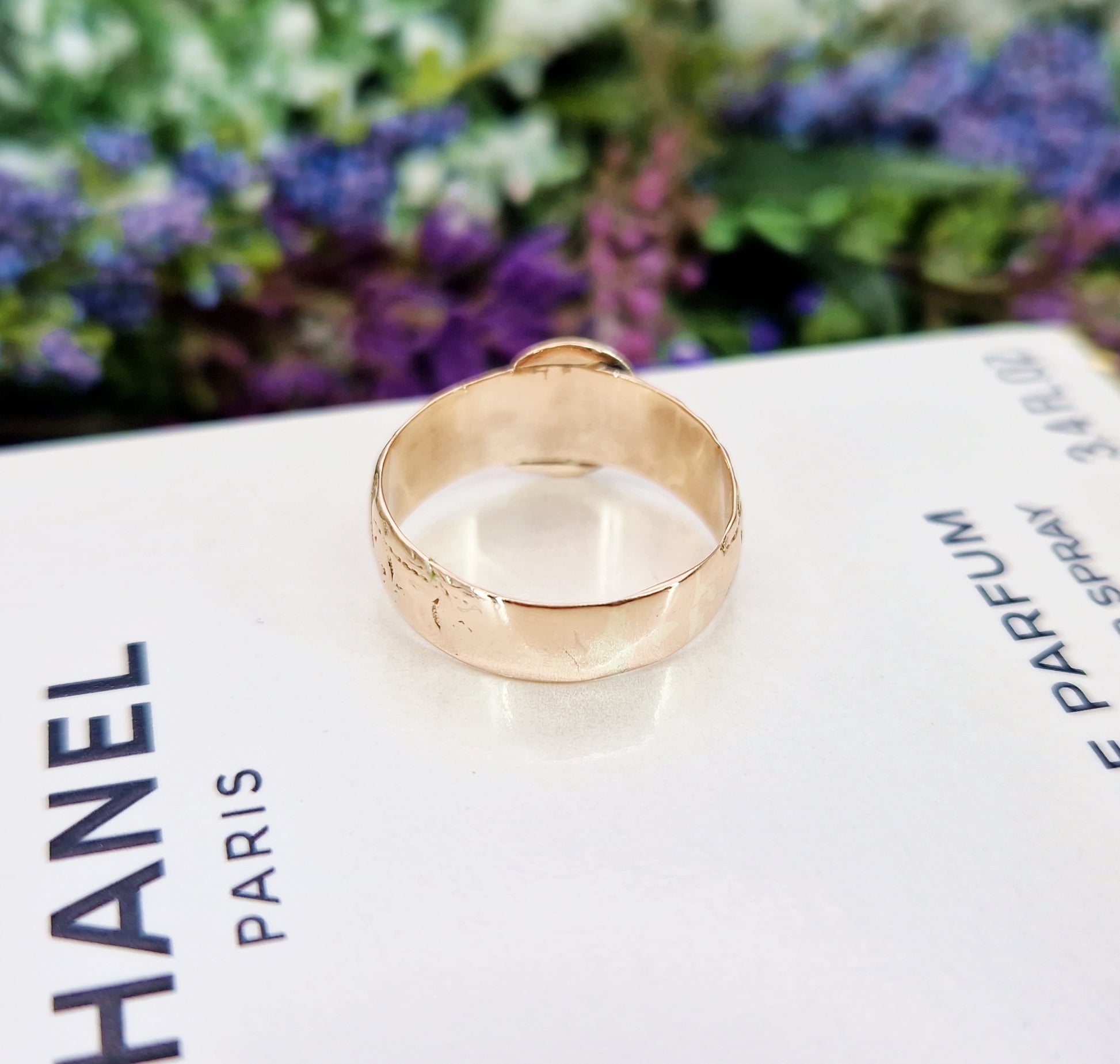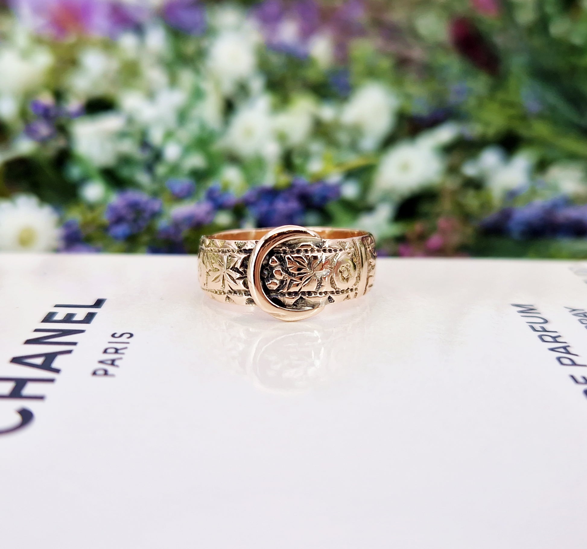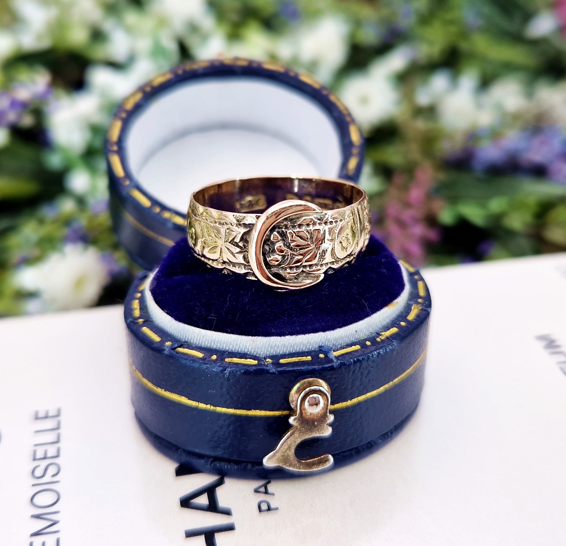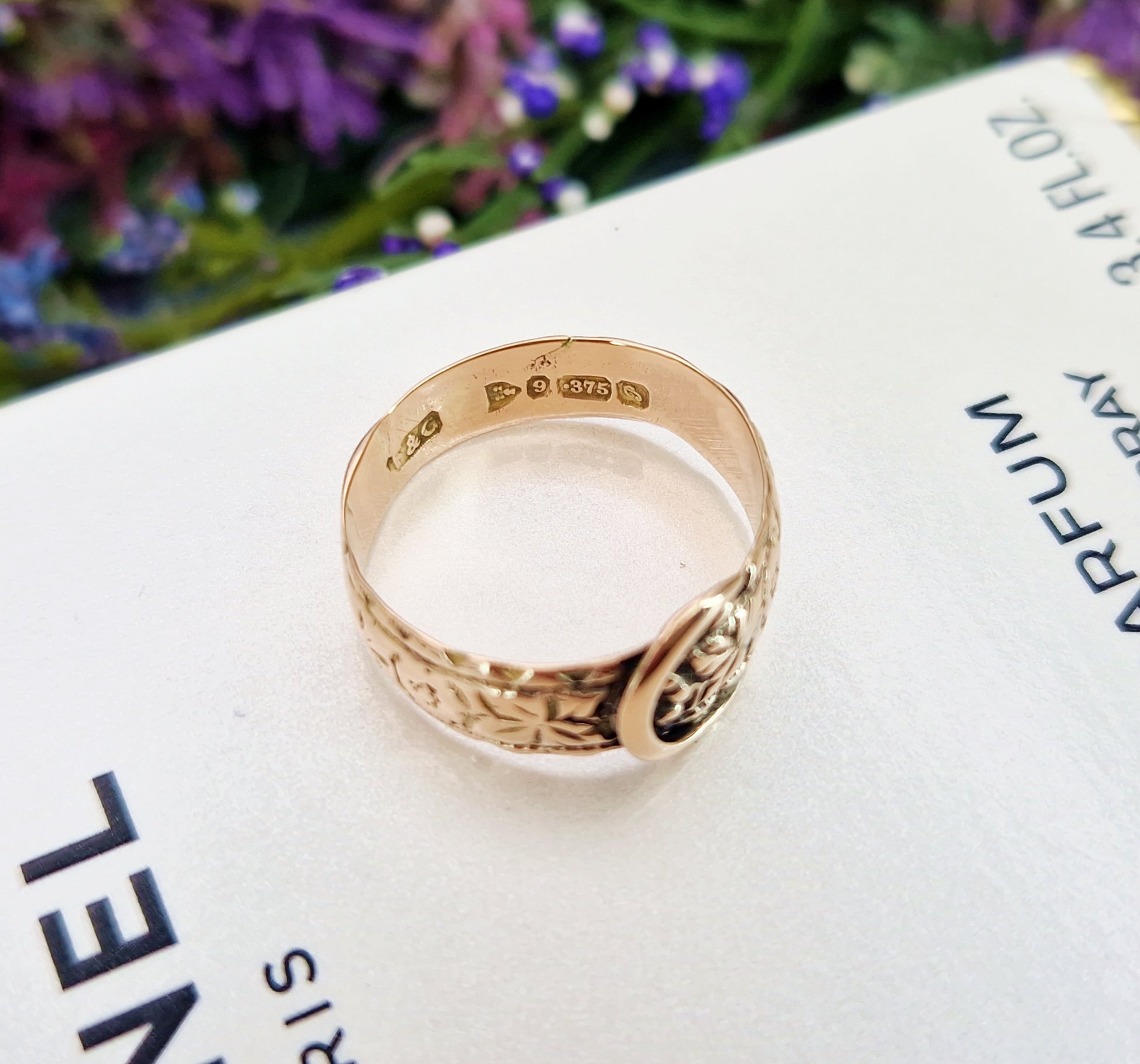 A truly beautiful antique Edwardian 9ct gold ring, fully hallmarked with British assay marks for the year 1915. This wide band ring is designed in the classic belt and buckle style. Crafted from warm antique gold, a rich tone that sits perfectly between yellow and rose - this ring has a wonderful softness and depth that only true antique gold can offer.