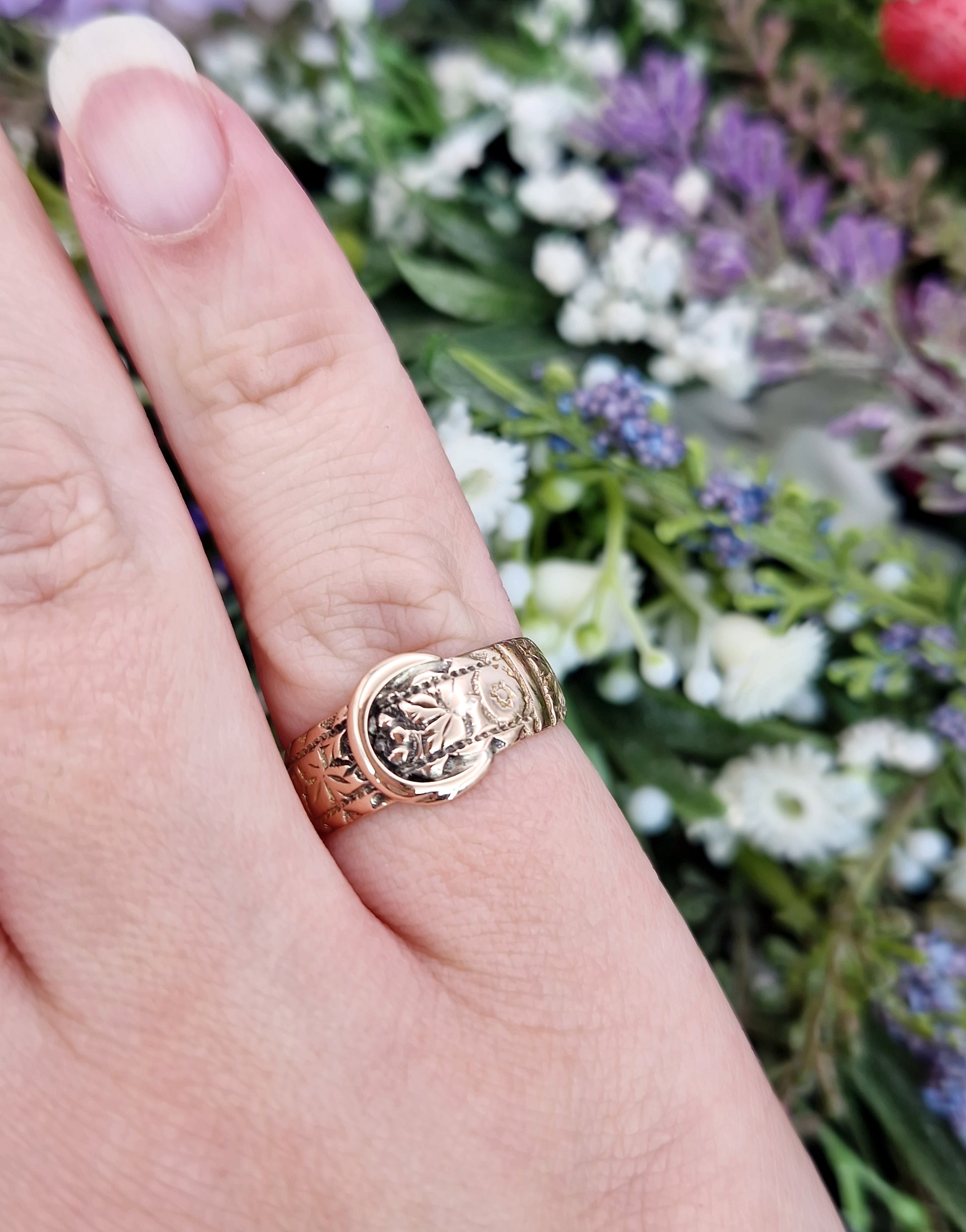 The surface of the band is highly ornate and hand-chased with fine botanical engravings - curling leaves, delicate flowers, and scrolling tendrils that wrap beautifully around the ring. Every detail has been carefully executed, showcasing the skill and artistry of early 20th-century goldsmiths.