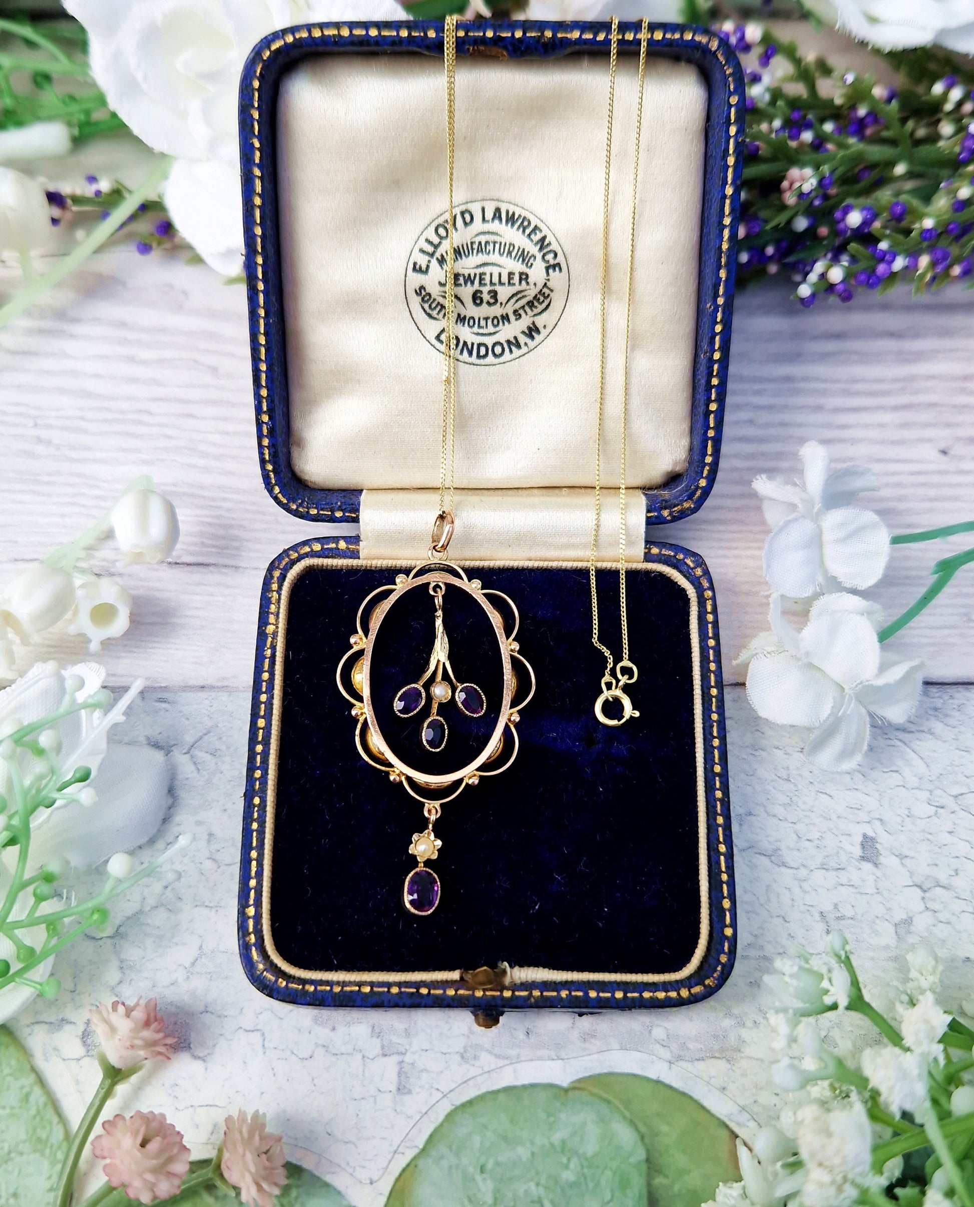 An absolutely beautiful Edwardian era (circa 1900) 9ct gold pendant. This stunning lavalier pendant is dainty and ornate, with a fine fluted style frame. Inside the frame is a gemstone drop that holds 3 small oval cut purple amethysts, and a small white pearl. Dangling from the bottom of the frame is further decor, another (slightly larger) oval cut purple amethyst with a tiny flower that holds another small white pearl. This is a fine quality piece of original antique jewellery that would make a very special gift idea, love token, or treat for yourself.