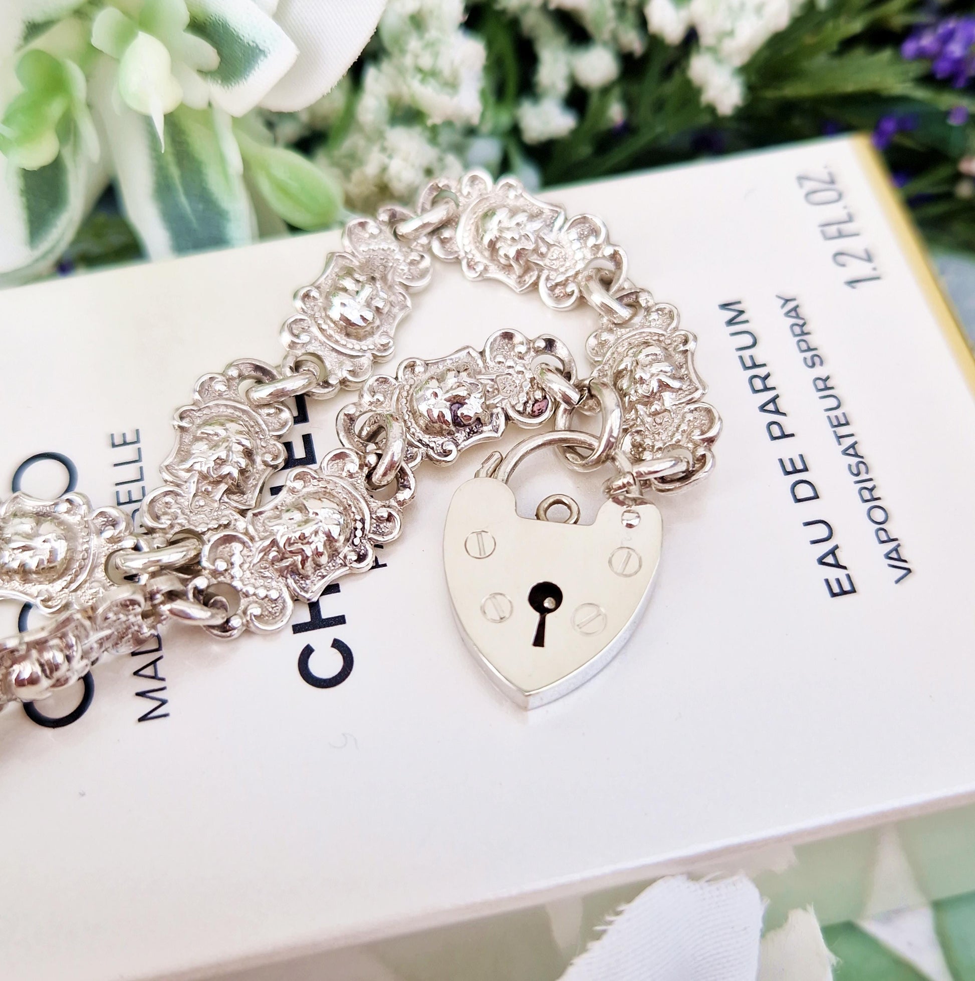 A gorgeous sterling silver bracelet. This beautiful bracelet is classic, yet has a wonderful twist. It is made of a series of panels, which are all solid sterling silver, and each panel is repousse style. The decorative panels look to us to depict lions heads? They are wonderfully ornate and unique. Amazingly - underneath each repousse lion head is a stamped lion passant hallmark. The bracelet closes with a heart shaped padlock, the heart padlock is plain with no engravings - minimal and elegant. A quality piece of unusual mid-weight sterling silver jewellery that would be lovely to give as a gift.