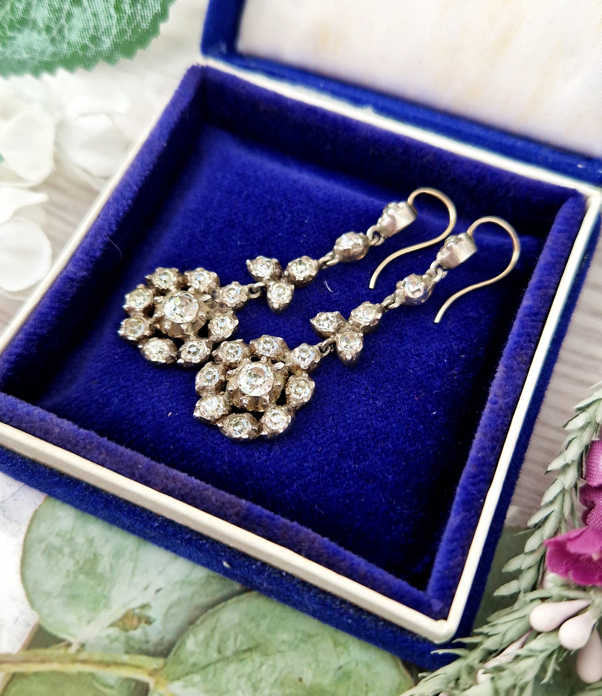 A gorgeous pair of decadent early antique Victorian statement cluster earrings, circa 1850. This incredible pair of earrings are really a magnificent find. They are made of solid sterling silver with 9ct gold hooks. They are set with twinkling hand single cut paste glass stones all over. The stones are held in collet settings, with closed backs, and they are likely foil backed. A beautiful quality pair of statement antique earrings, they would look magnificent for a dinner party (old stones sparkle best in candle and low lighting!). They would be stunning for bridal wear too, worn with antique lace. They have a lovely movement when worn, due to their long length and 3 articulated joined elements.