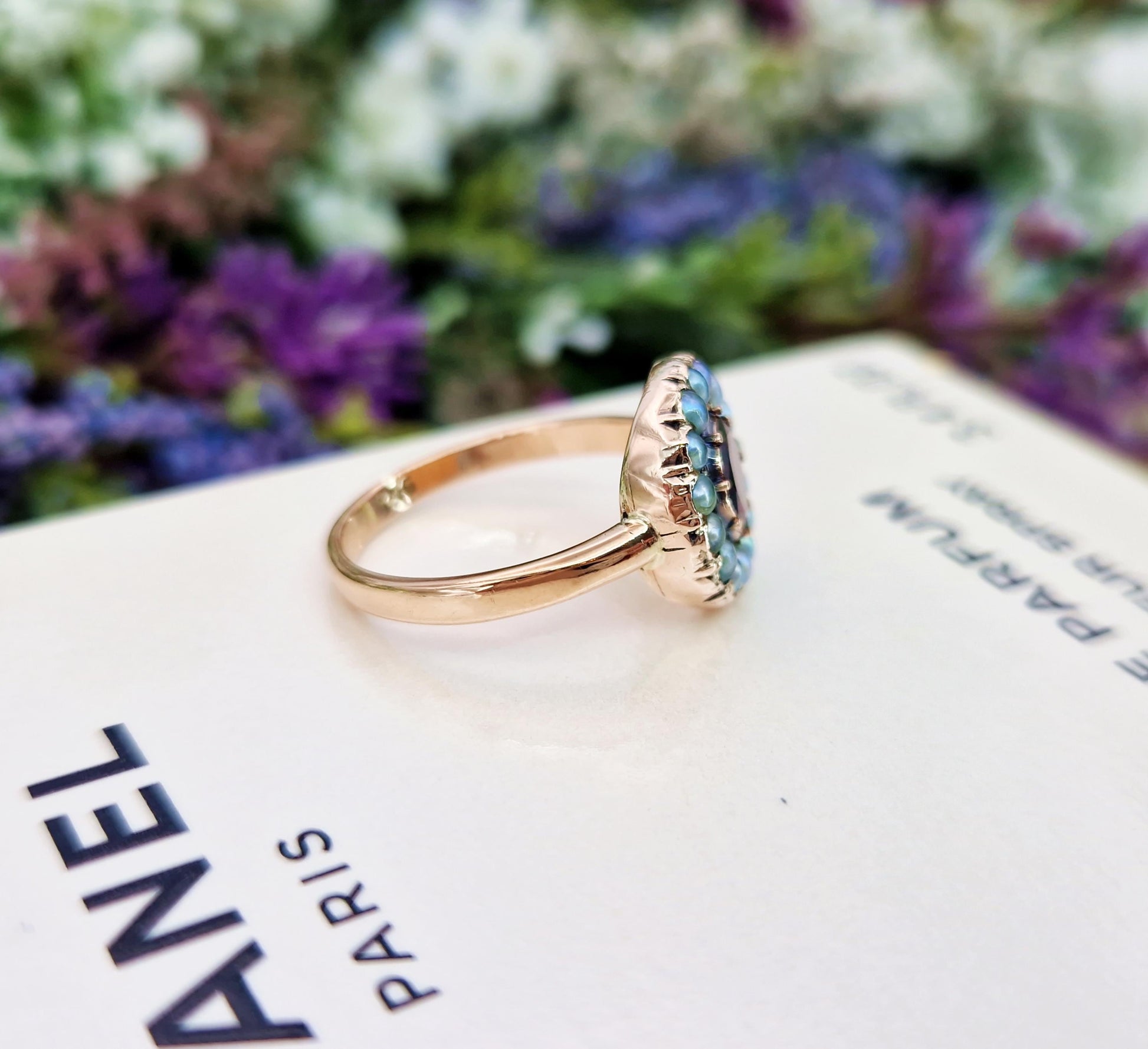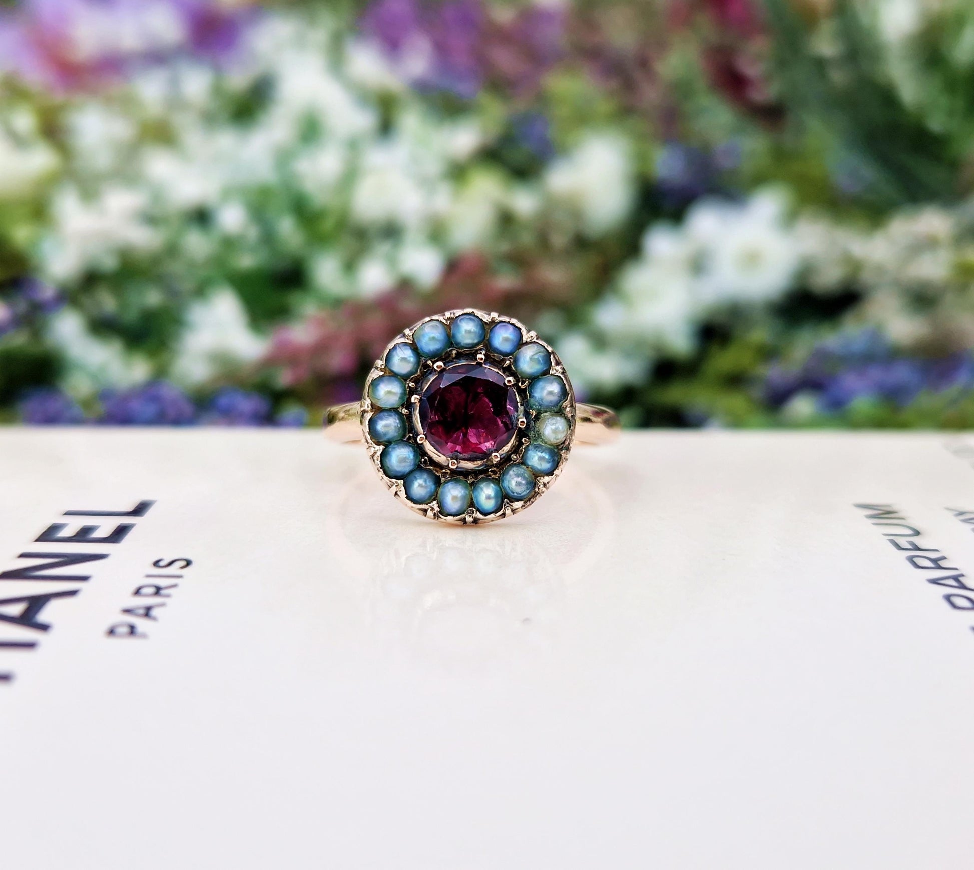 This gorgeous antique find is a solid 9ct gold ring from the early Victorian era, circa 1840. This lovely cluster ring makes a statement on the finger, with a central round flat cut antique red garnet which is surrounded by a halo of natural glowing silver seed pearls. The whole face of the ring has a close curved back, and the garnet has foil behind it - a typical and beautiful trait of early Victorian era designs. The mount is beautiful and simple and allows the gemstones to shine with non-distracting small prongs and crimped fluted bezels. Antique rings of this quality are becoming exceedingly hard to find, we are thrilled to offer this one in our collection.