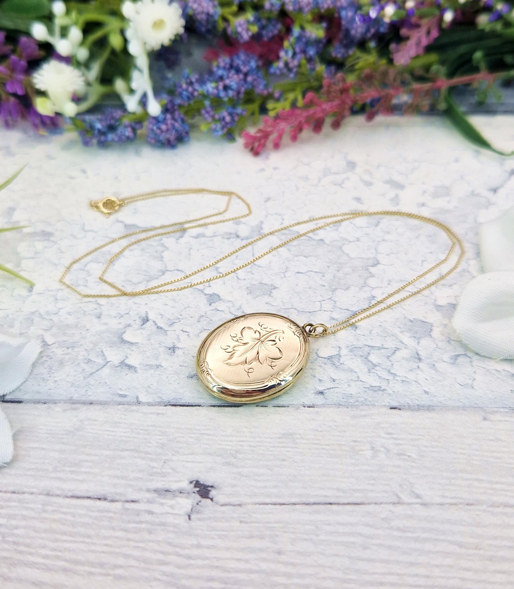 Antique Victorian 9ct Gold Ornate Engraved Ivy Leaf Oval Shaped Locket Pendant