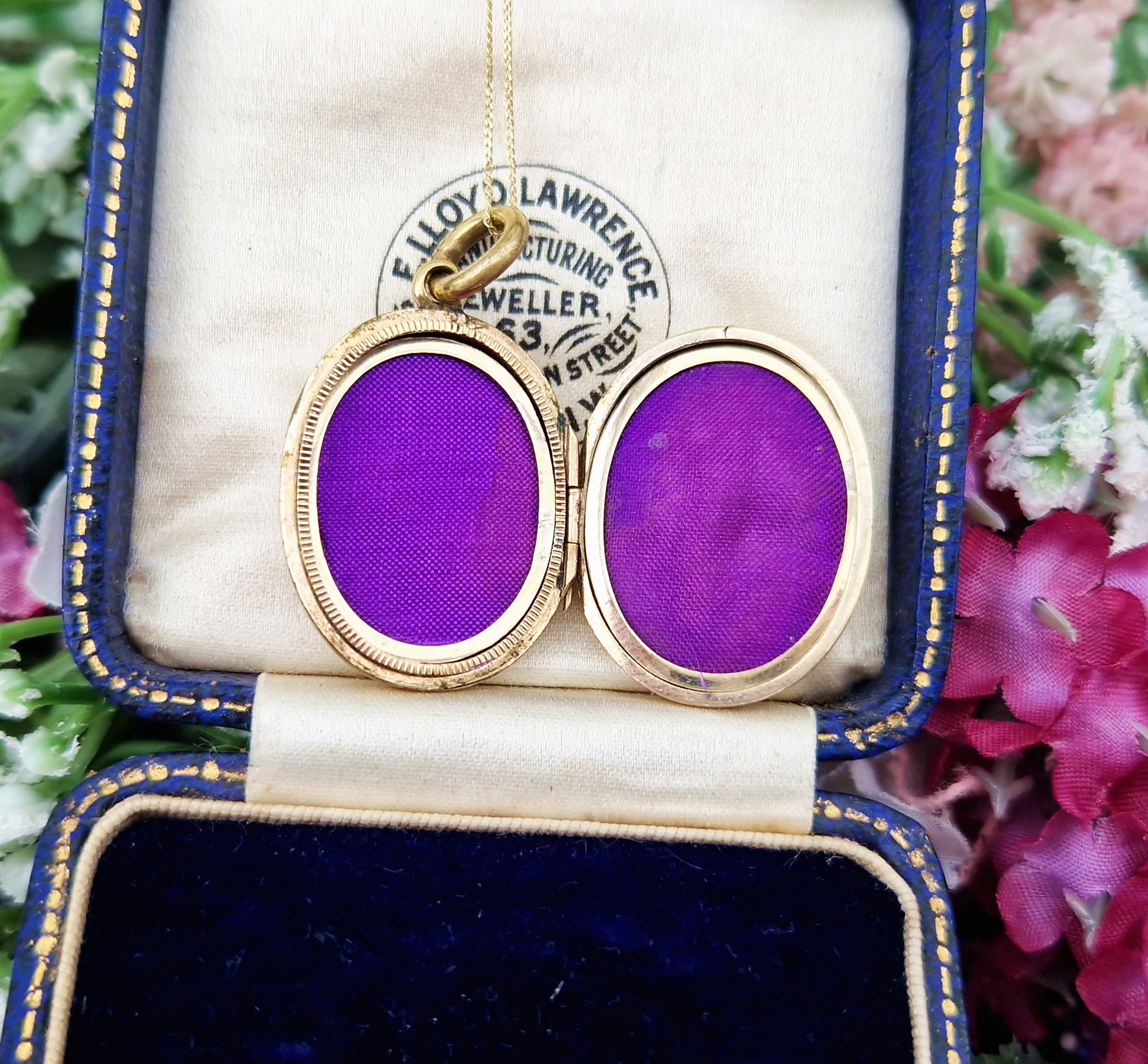 Testes as 9ct Back and Front. 9ct Gold Back and Front lockets were typical of gold lockets from this era. In the late Victorian and Edwardian period, lockets were manufactured with solid gold fronts and solid gold backs – to clarify, the metal at the front is a sheet of solid gold and the metal at the back is also a sheet of solid gold. Using this method allowed heavy engraving which would not be possible on rolled gold or gold plating. The sides, hinges and the loose frames inside are usually made of a sturdy base metal that has been gold plated. The reasoning behind such construction is that gold is a soft metal and lockets by default are opened and closed regularly. Using a sturdier metal than gold meant that they were less likely to buckle or break. These lockets are 90 – 95% solid gold and in the parts that are not they are gold plated and the plating is generally of such a good thickness that it still stands 100 years later.