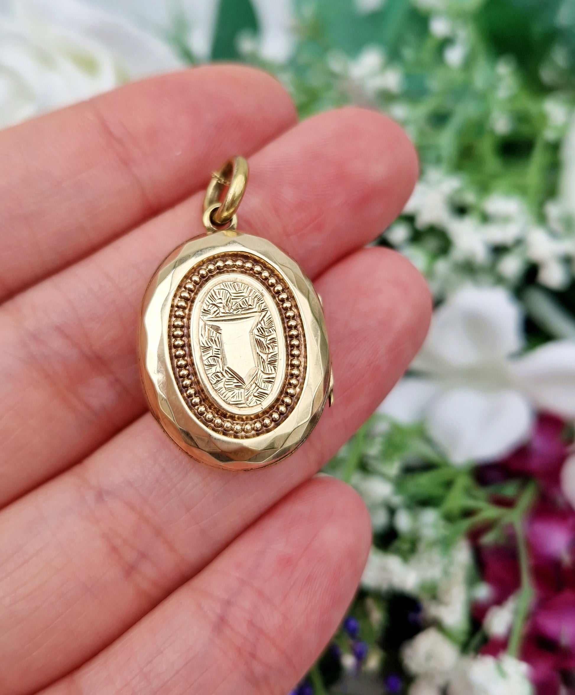 This beautiful antique locket is circa 1890 - a true Victorian era piece, it is made of a warm old yellow gold. The front of the locket is engraved with a decorative cross, with a beadework frame. The back has ebeen engraved with a blank shield cartouche, with matching beadwork frame. The outer edges of the locket metal are fected, which creates a wonderful texture tha dances in the light. A lovely, chunky, antique locket that would make a very special gender neutral gift idea. In excellent condition for it's age.
