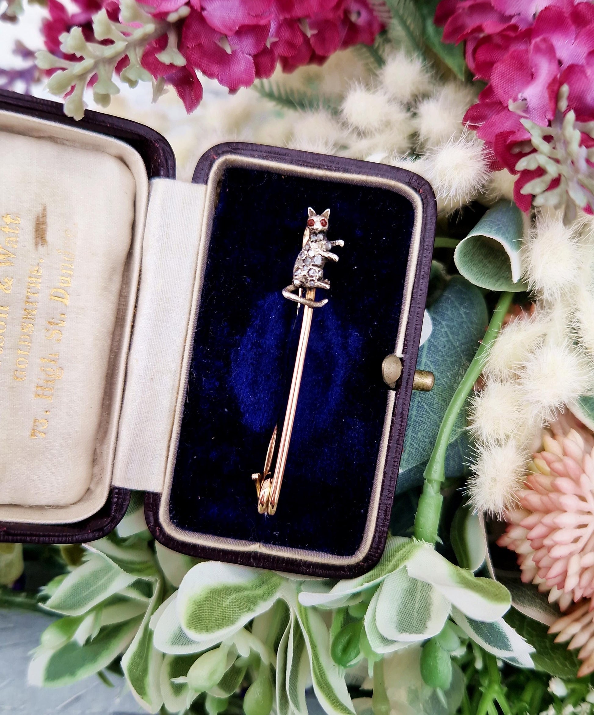 This brooch unmarked, but has been tested and verified as solid 9ct gold. The cat himself, is made of solid sterling silver.