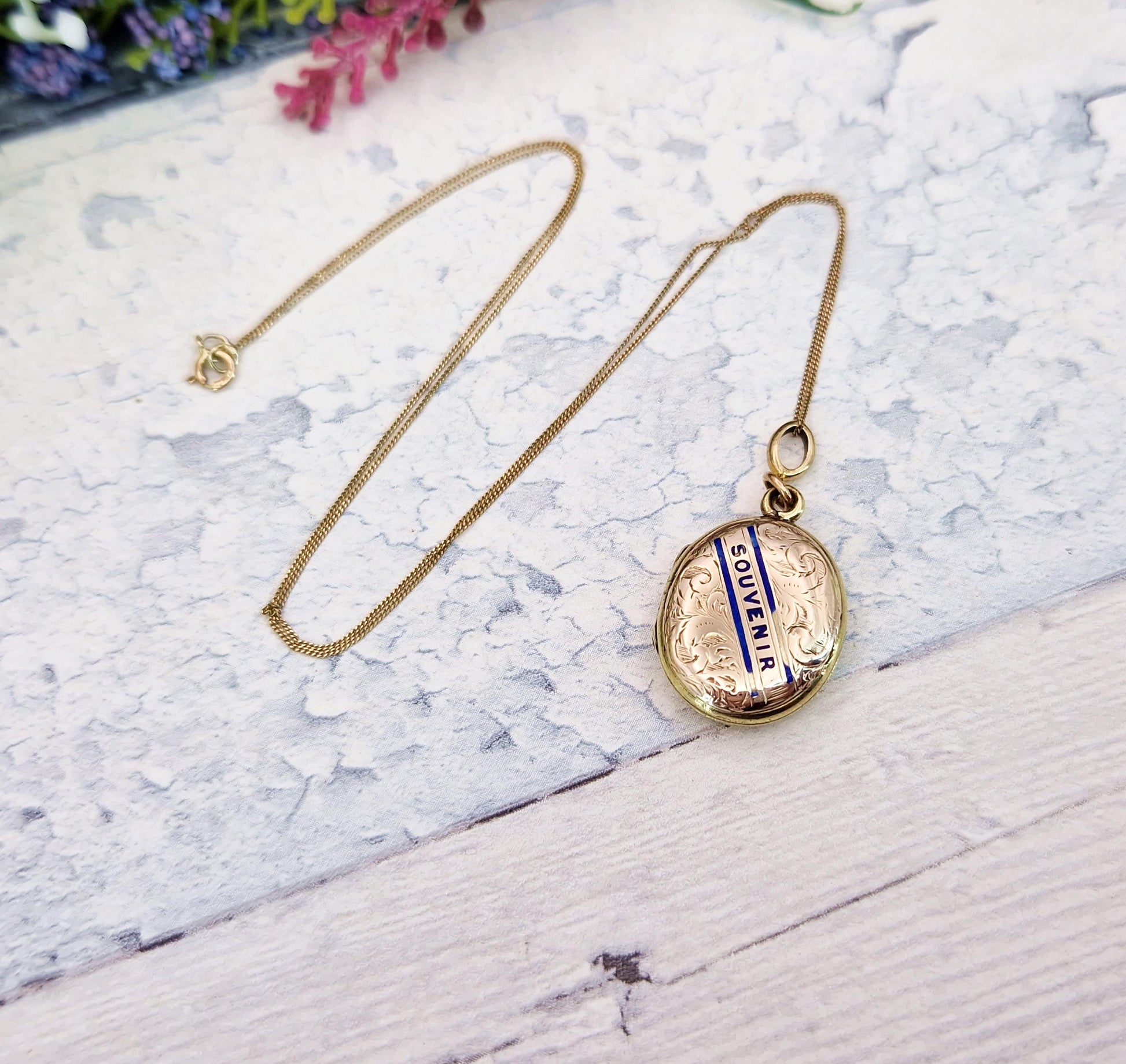 This beautiful antique locket is a true piece of Victorian sentimentality, crafted in warm yellow gold with intricate flourish engraved detailing on the front and back. The front features the word “Souvenir” in striking blue enamel, symbolizing a cherished keepsake or memory. On the reverse, a finely detailed blue enamel belt buckle motif adds even deeper meaning - belt and buckle designs were highly popular in Victorian jewellery, representing eternity, loyalty, and unbreakable bonds. Its golden hue and vibrant enamel make it a standout treasure for any antique collection. Perfectly sized for daily wear or to layer with other antique chains, this piece carries the elegance and symbolism that define the Victorian era.