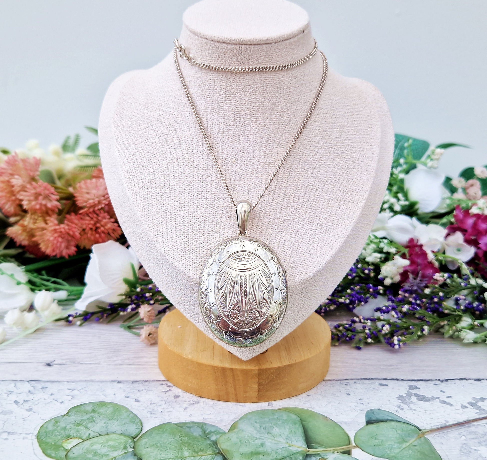 Unmarked but tests as Sterling Silver Back and Front. Back and Front lockets were typical of lockets from this era. In the late Victorian and Edwardian period, lockets were manufactured with solid silver fronts and solid silver backs – to clarify, the metal at the front is a sheet of solid silver and the metal at the back is also a sheet of solid silver. Using this method allowed heavy engraving which would not be possible on silver plating. The sides, hinges and the loose frames inside are usually made of a sturdy base metal. The reasoning behind such construction is that lockets by default are opened and closed regularly. Using a sturdier metal than silver meant that they were less likely to buckle or break.