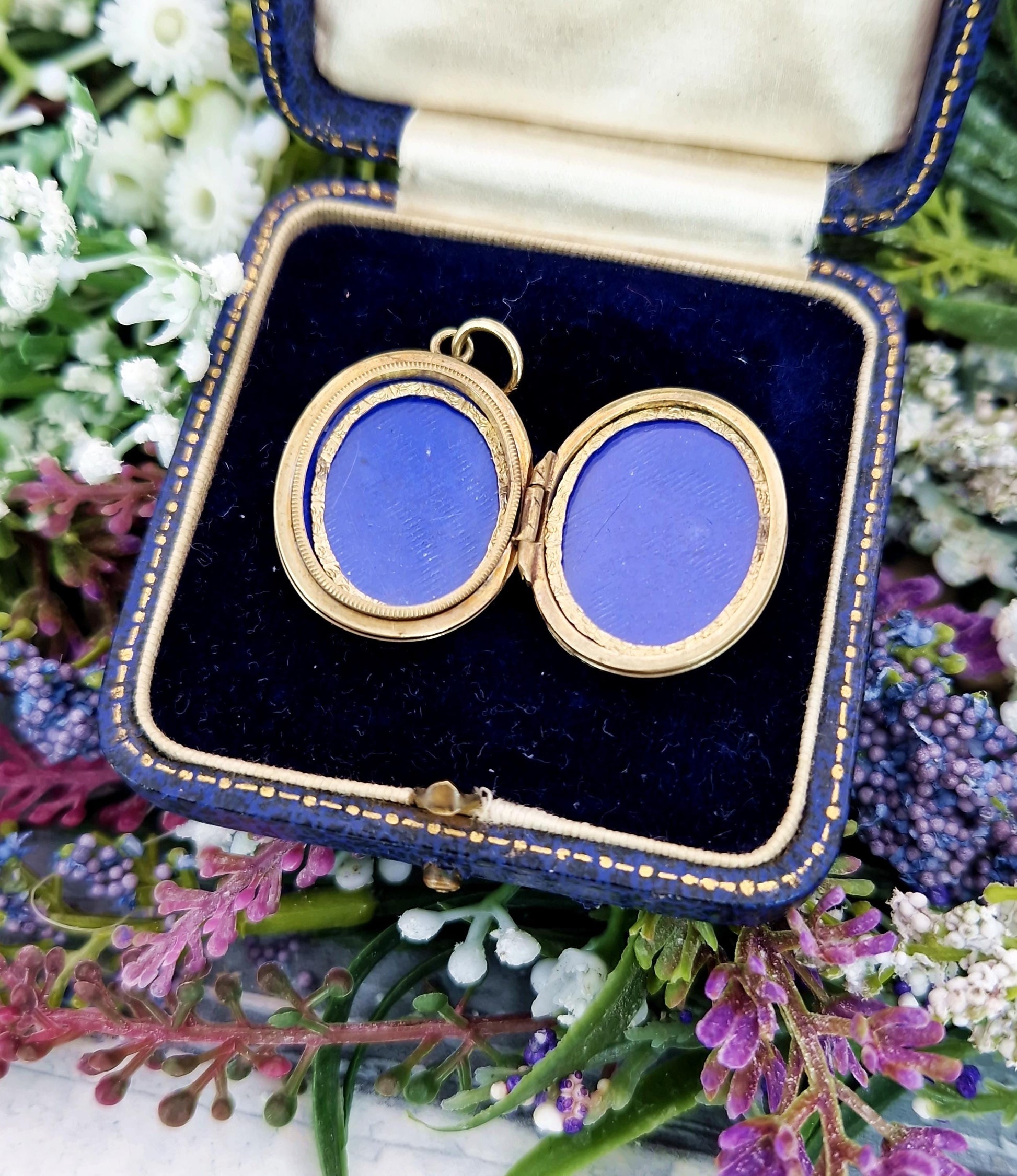 A beautiful antique Victorian era locket, made of a gold tone metal circa 1890. This lovely locket is oval in shape and is a classic medium size. It is detailed on both sides, with the same design on both sides. There's a lovely engraved swirl pattern, with a geometric element down the center. The original frames inside are engraved also, which is a lovely attention to detail we rarely see. A lovely antique locket.