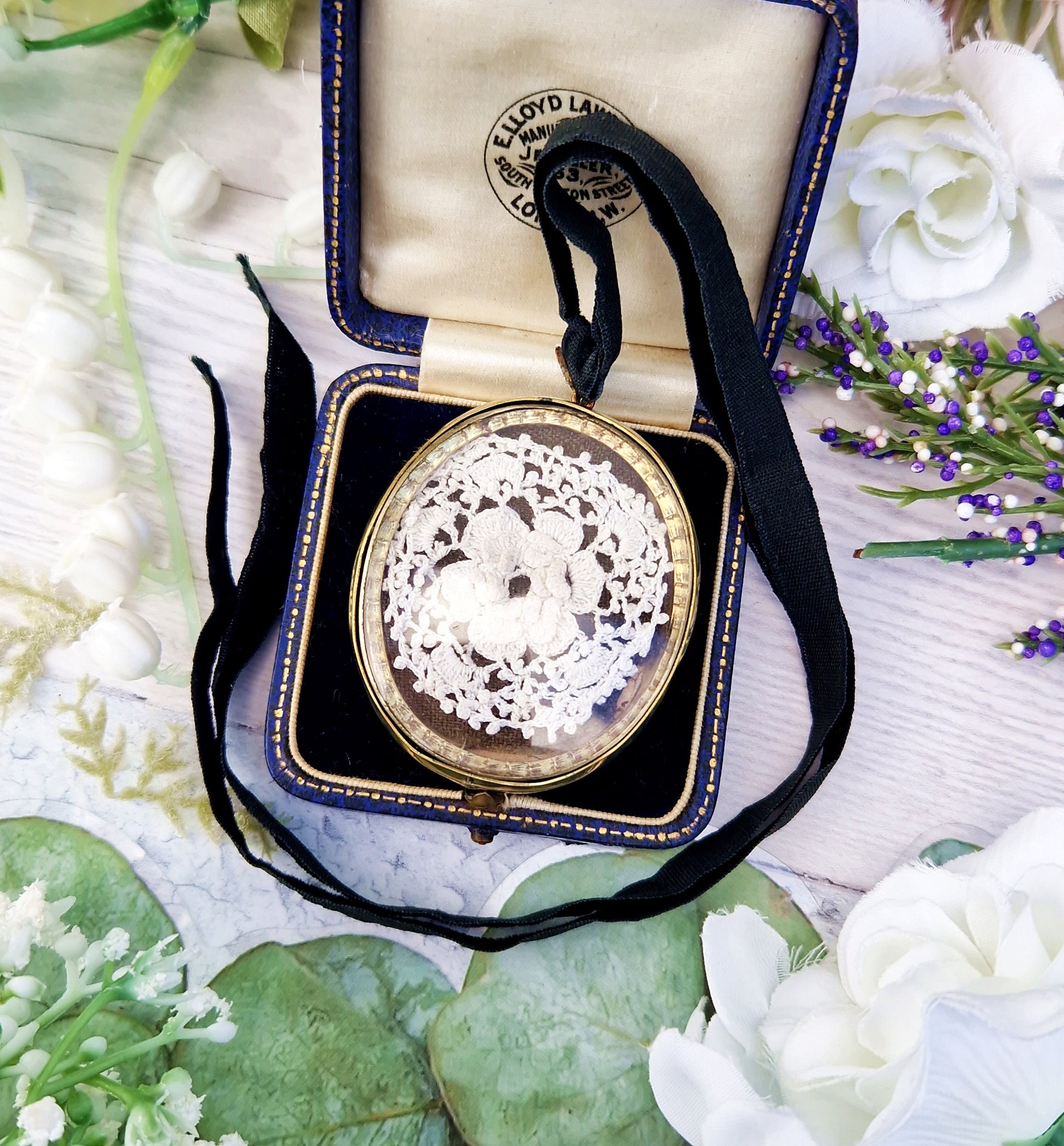 Inside the locket a true story is told. On one side, we have artwork of arranged human hair, with gold wire detailing and tiny natural seed pearls. On the other side, we have a panel of lace. We can presume the lace was from an outfit of a loved one (perhaps even a wedding dress) and has been preserved alonside locks of their hair in a mark of celebration of the life. This mourning locket would have been made by a loved one to wear in memorial of the deceased. It sit upon, what we preusme, is the original length of black velvet ribbon. This ribbon can be tied around the neck to wear this exceptional piece of history.
