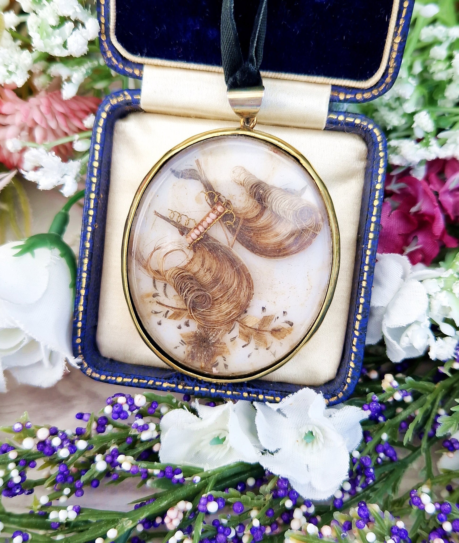 Antique Victorian Large Oval Glass Hair and Lace Statement Mourning Locket Pendant