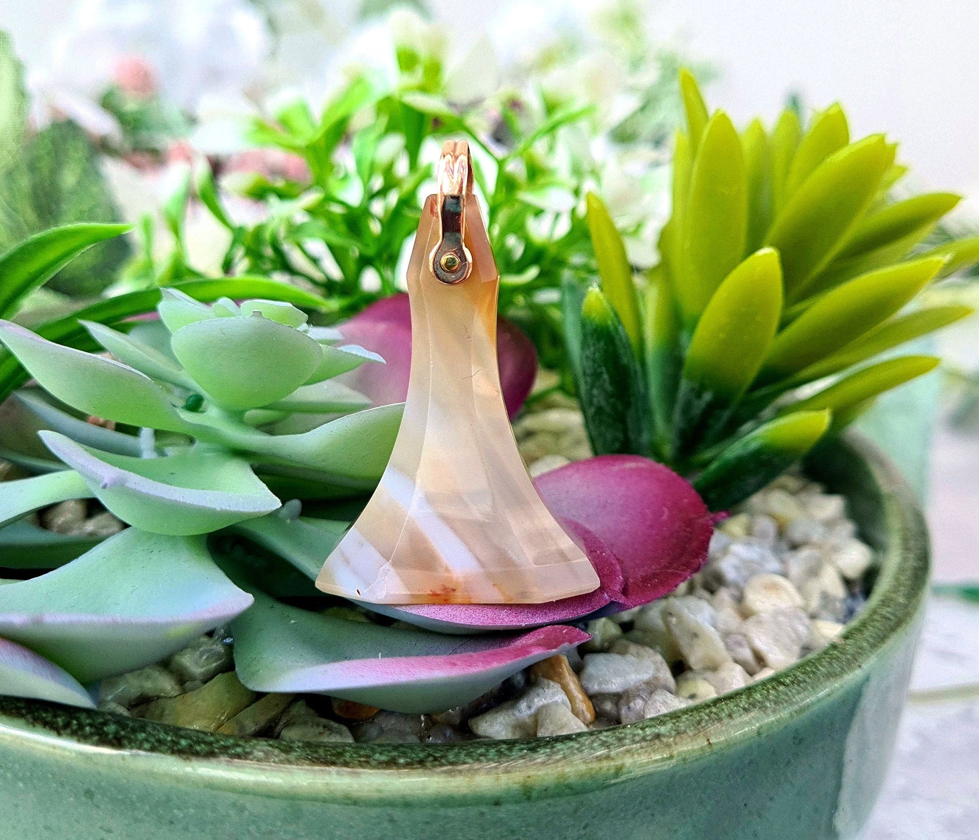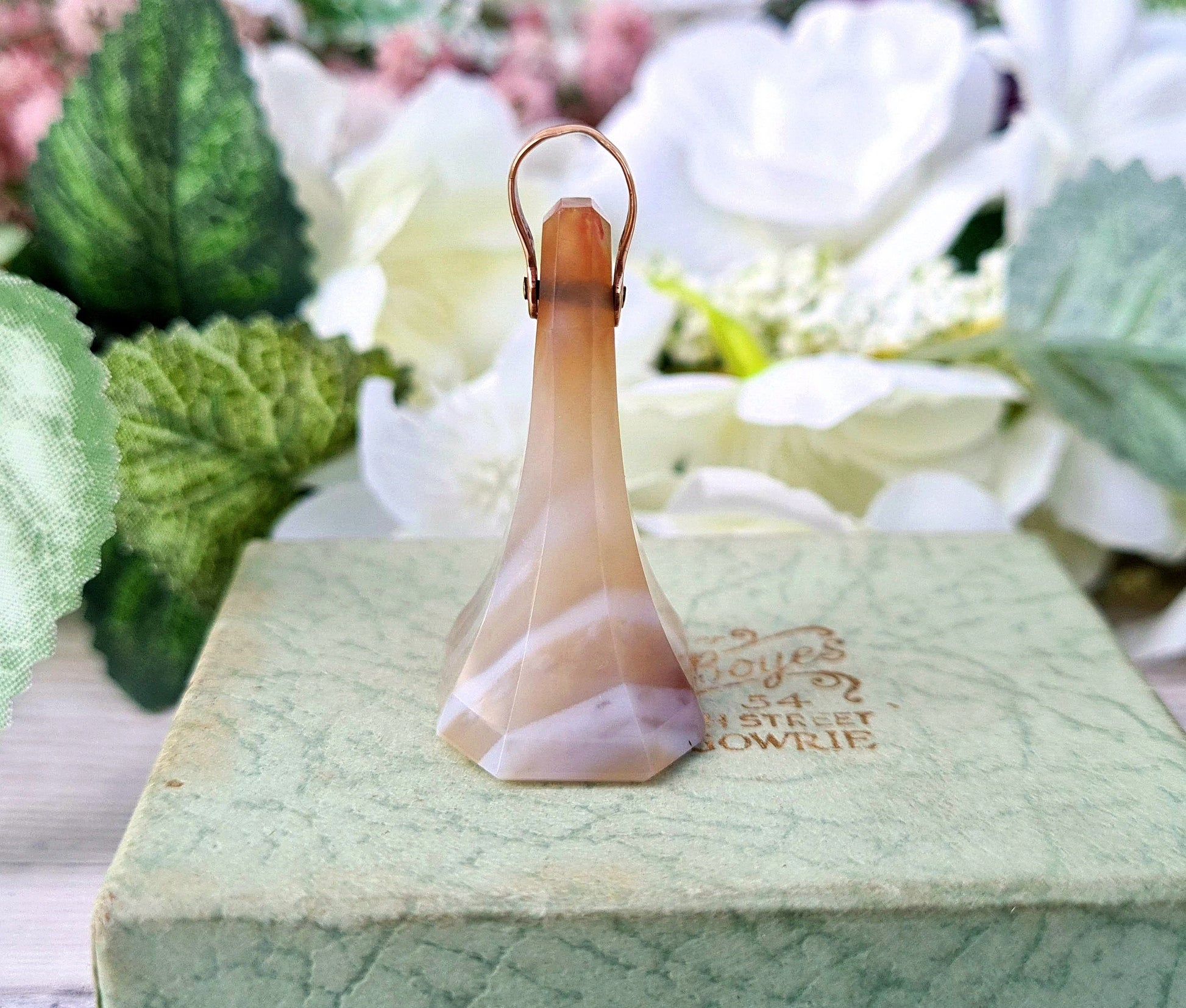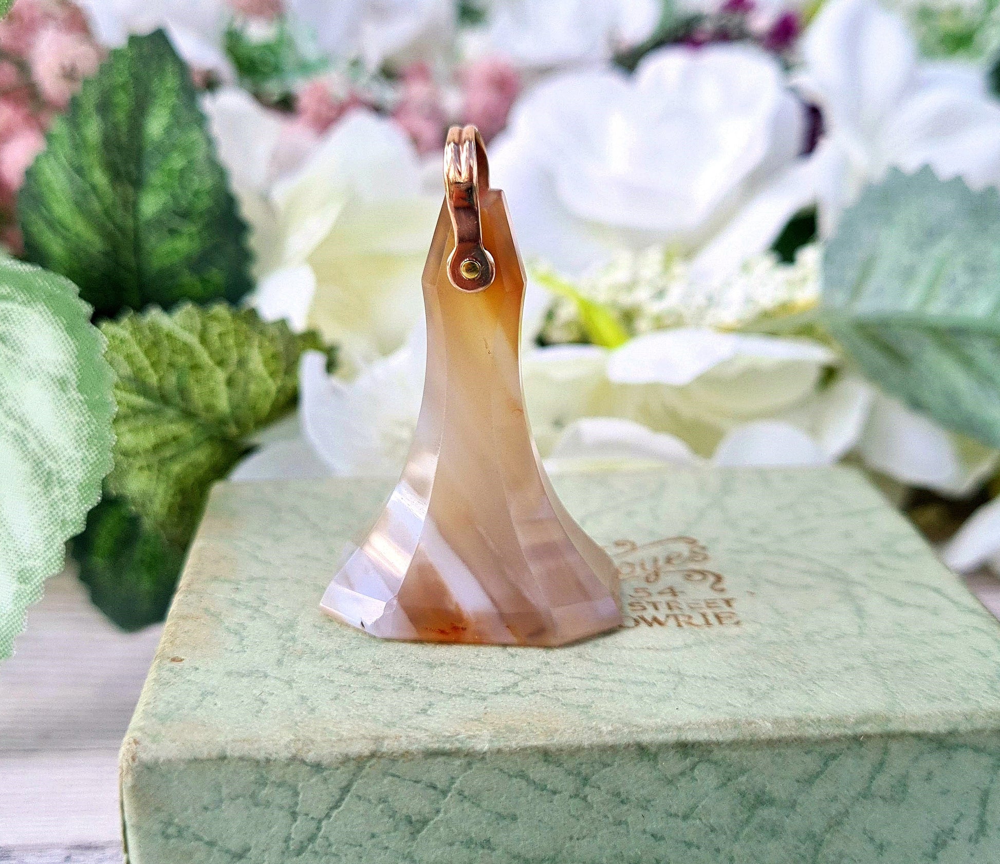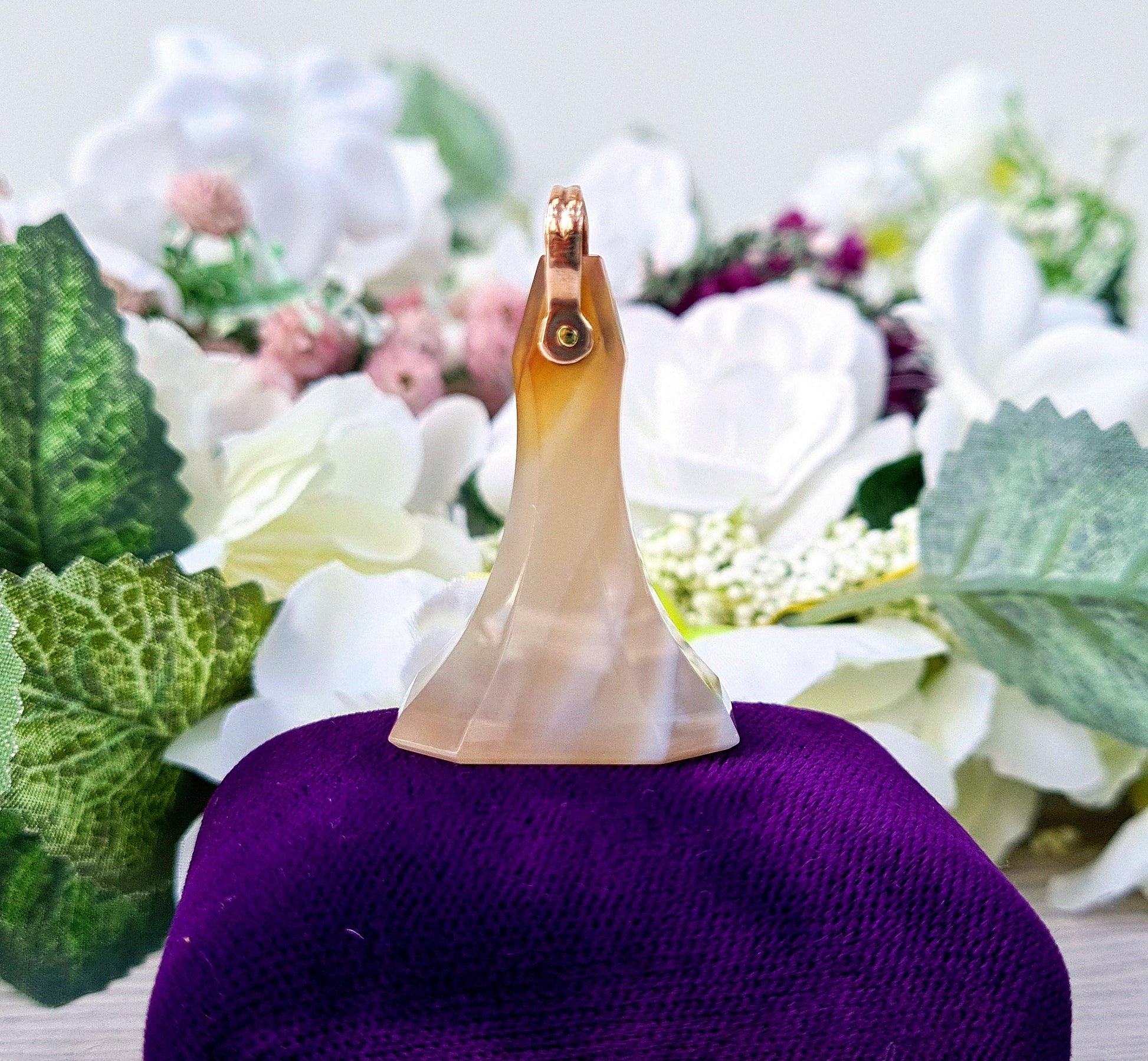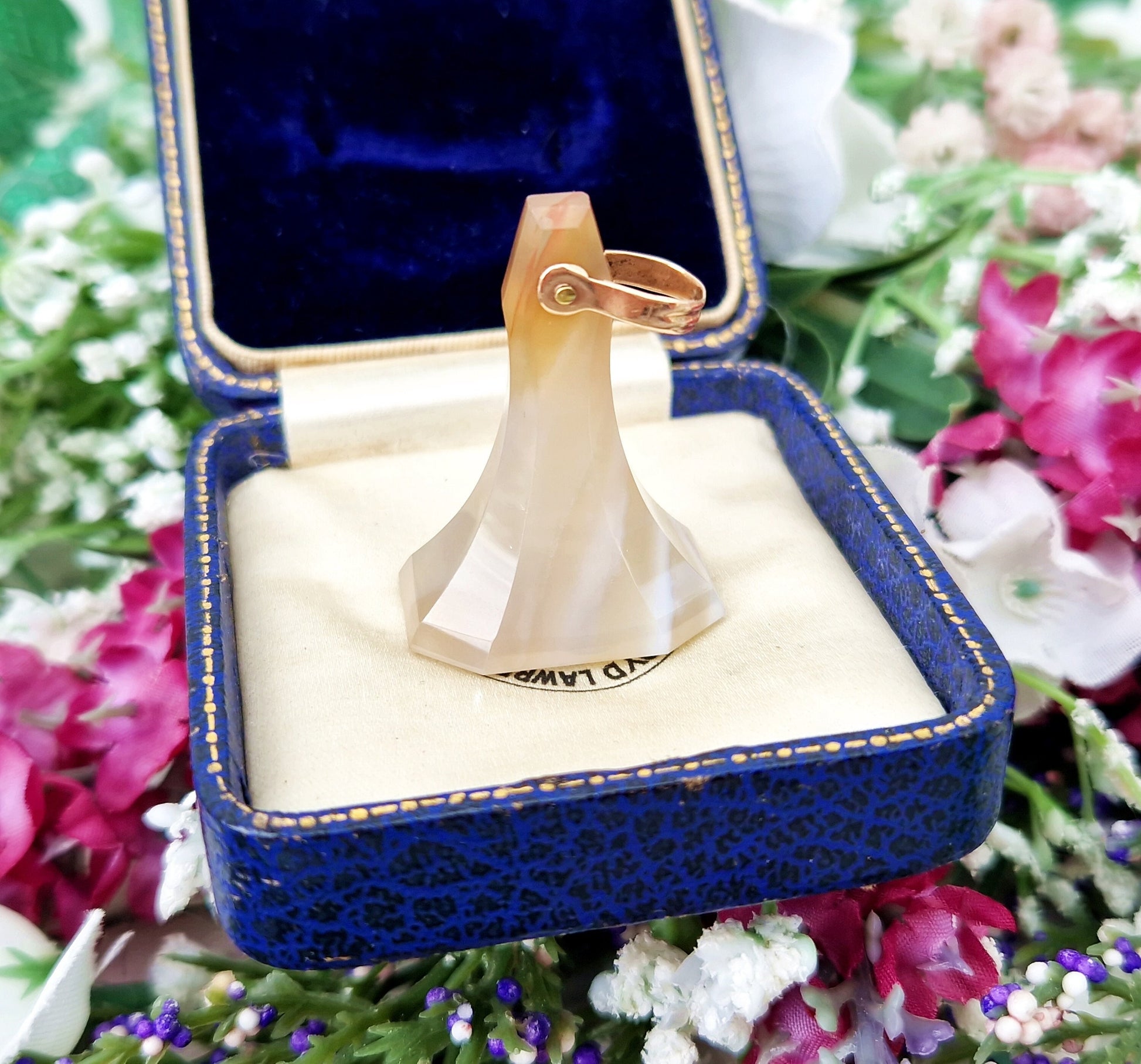 A stiking and beautiful antique Victorian era fob seal. This unique and rare find would make a stunning pendant. With a solid 9ct rose gold bail loop that articulates from the head of an impressive smooth carved agate (chalcedony) fob. This huge piece of agate has wonderful natural bands of colour (white, beige, cream, grey, orange and brown), and an ethereal translucent glow. We found this piece locally (near Dundee, Scotland), and believe it is indeed from Scotland in origin, perhaps an agate from the cairngorm hills. The fob is engraved with two scrolled initials - these could be percieved in many ways, but to me they most look like a 'JI'. What initials do you see? The crevice of the engraving holds some wax, which shows that this seal was indeed used over the years of it's existence.