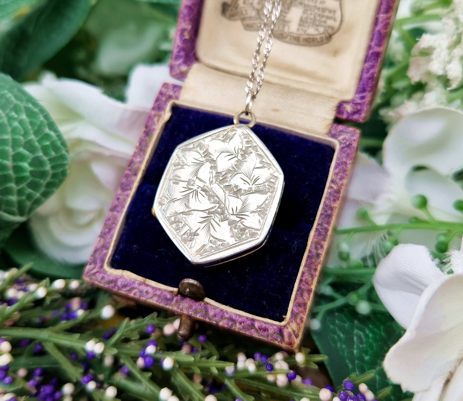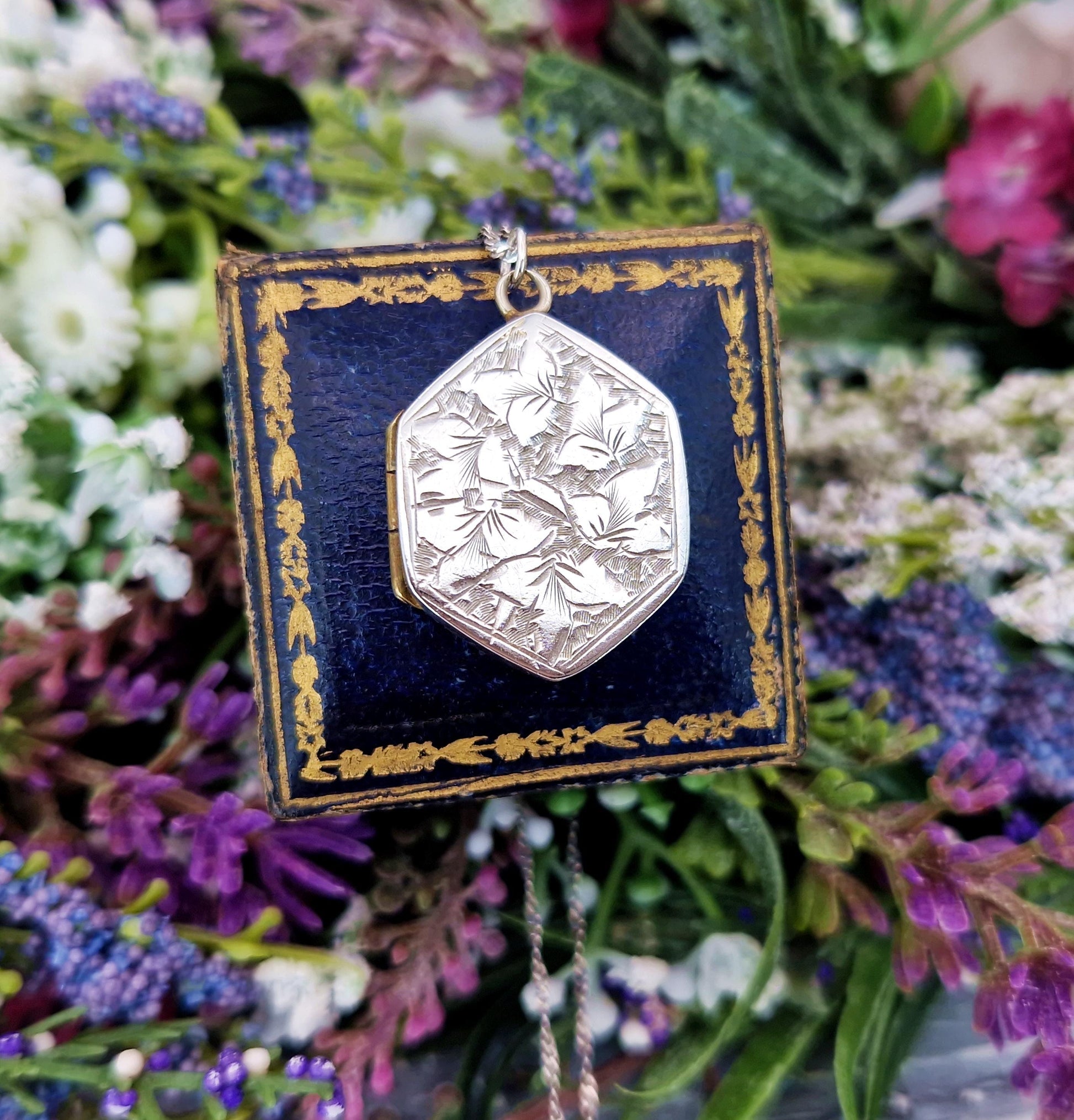 This beautiful antique locket dates to the late Victorian era, it was made around the time of the aesthetic movement (circa 1890). This lovely locket has engraved ivy leaf details to the front and a plain back. The shape of this locket is unique, like a shield. The cascading ivy leaves on the front are a beautiful sight, as in the Victorian language of flowers ivy leaves represented 'everlasting love'.