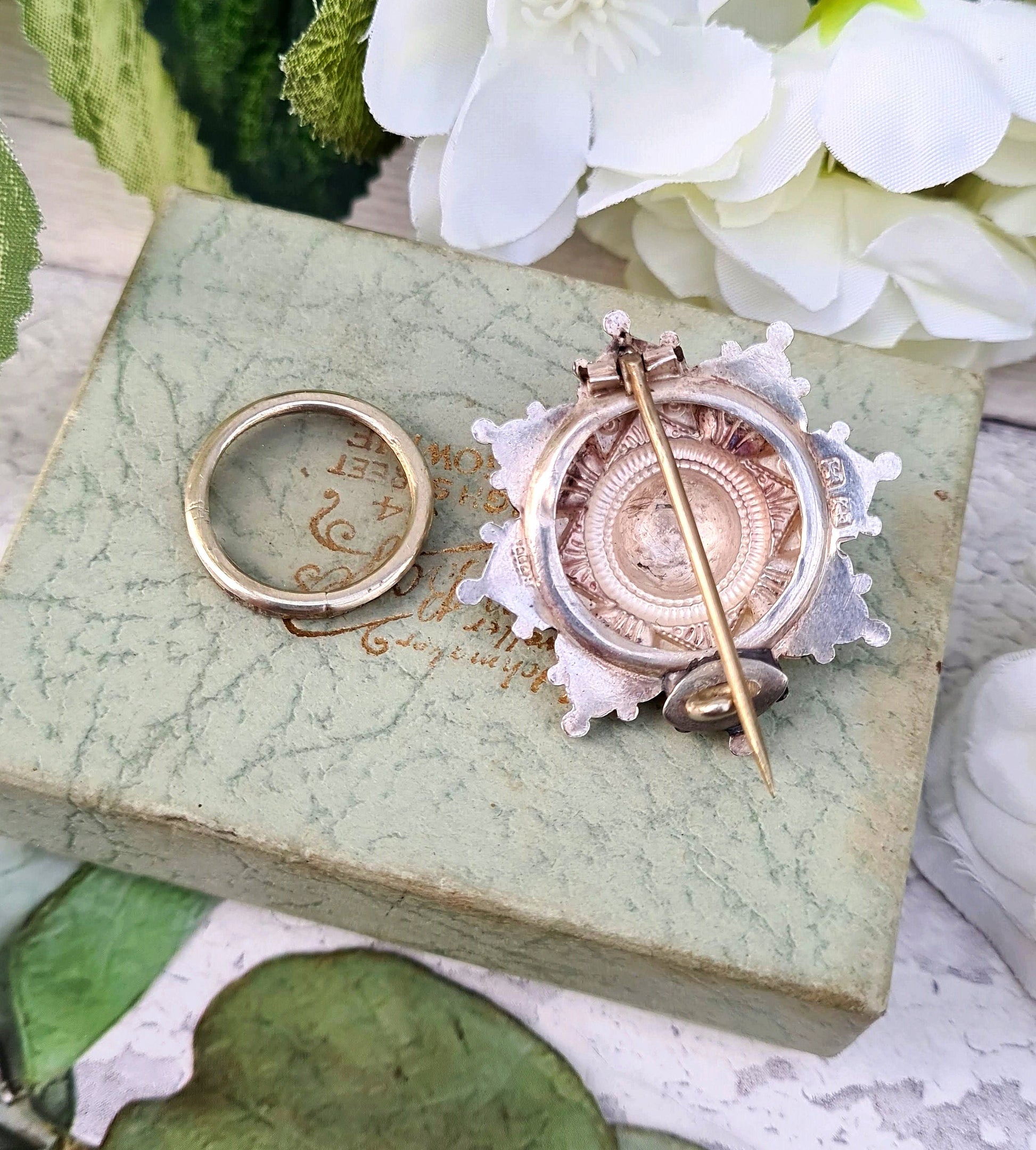 A beautiful antique Victorian era brooch. This brooch is shaped like an ornate star, and features wonderful relief detailing. Inside the back of the brooch behind the pin, is a glass locket panel. This brooch is a raised puffy style, so the inner area of the locket is fairly deep and could be used to hold tiny gemstones or a lock of hair. The locket is a tight fit but can be gently removed with care, so you could add your own contents inside. A gorgeous antique aesthetic piece of jewellery.