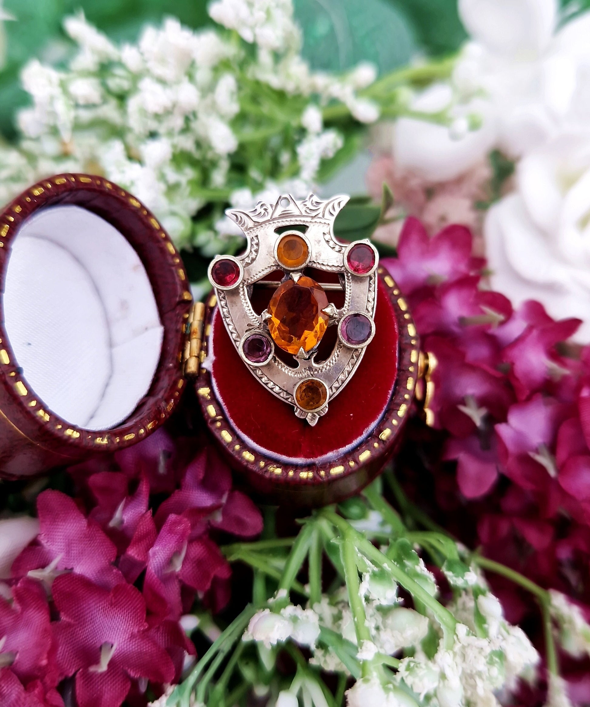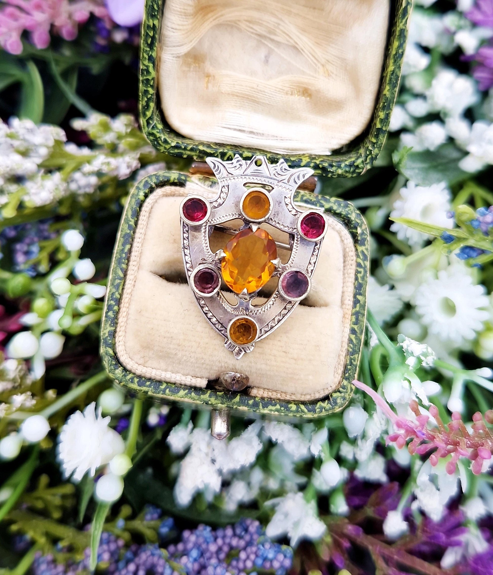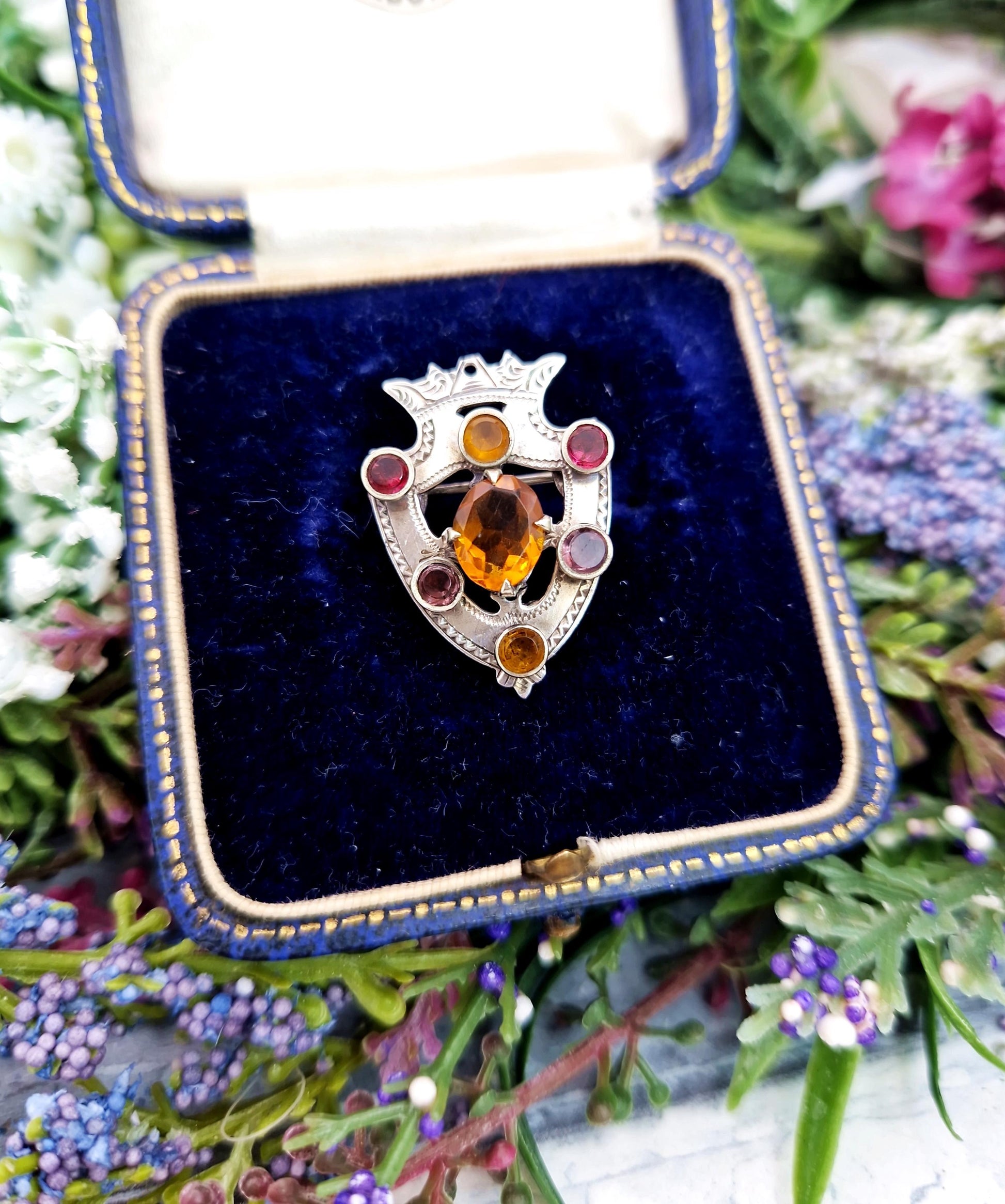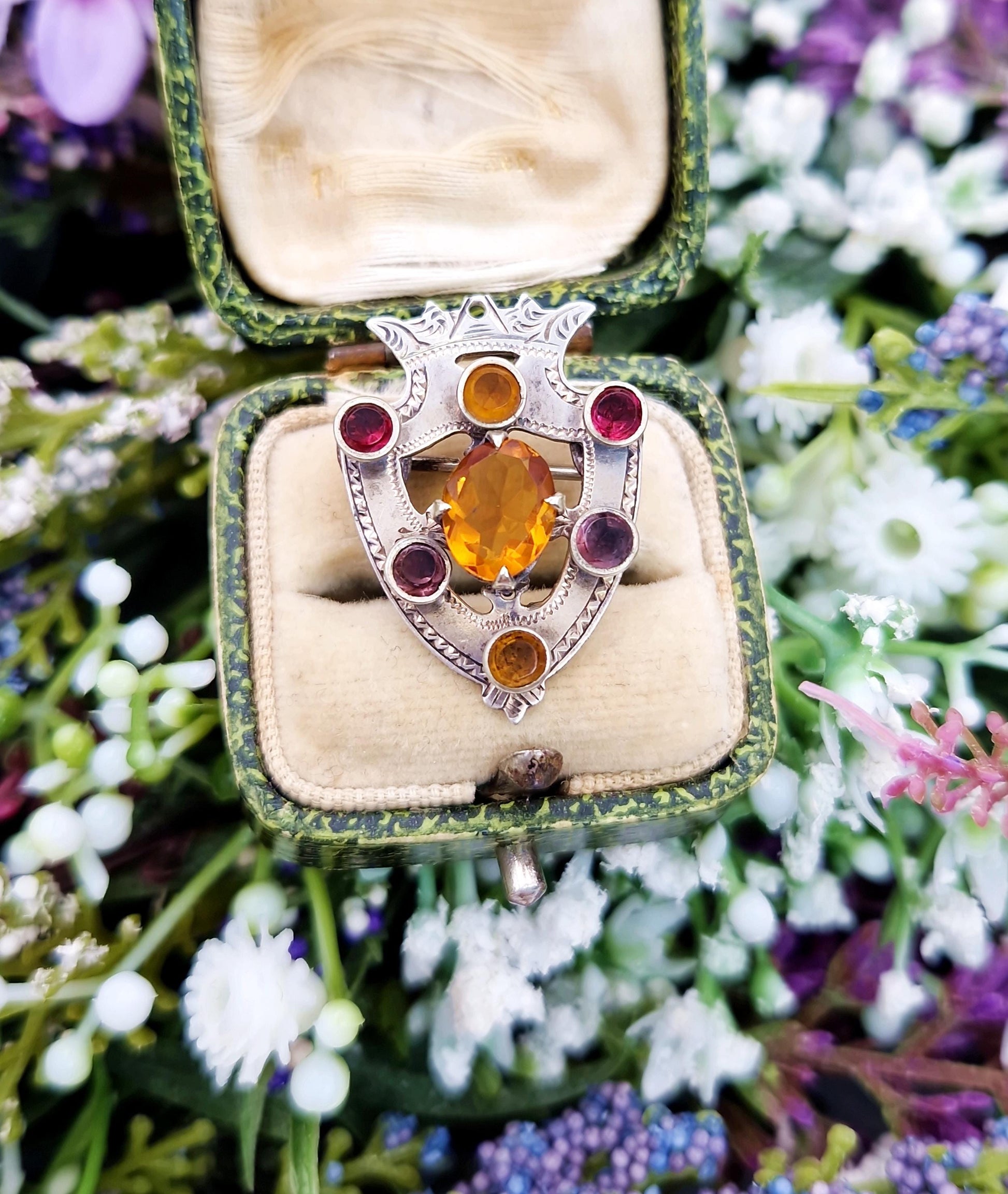 A gorgeous antique Victorian era brooch in the shape of an ornate crowned heart. Most likely a Scottish 'Luckenbooth' design. This heart is set with a large golden oval stone in the middle, and a further 6 surrounding smaller circular stones - 2 are golden orange, 2 are smoky brown/purple hue, and 2 are a reddish pink. The brooch also shows fine engraved detailing on the front.