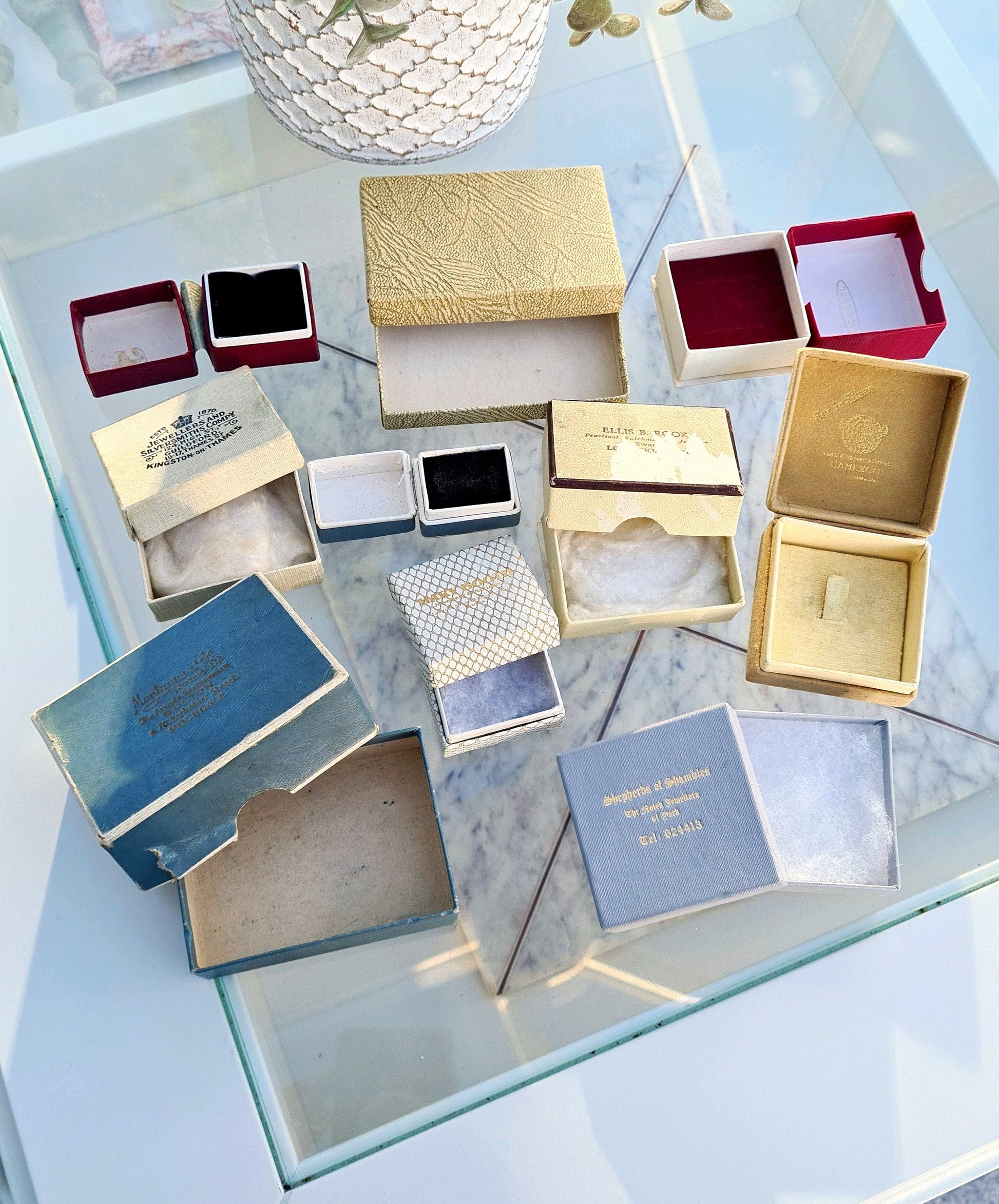 All are made of a stiff card type material, one is flocked. They range is size with the largest being 8 x 6 x 3 cms, and the smallest being 3.5 x 2.7 x 3.2 cms. Some have cotton inside, some are empty. Some have branded names with lovely fonts.
