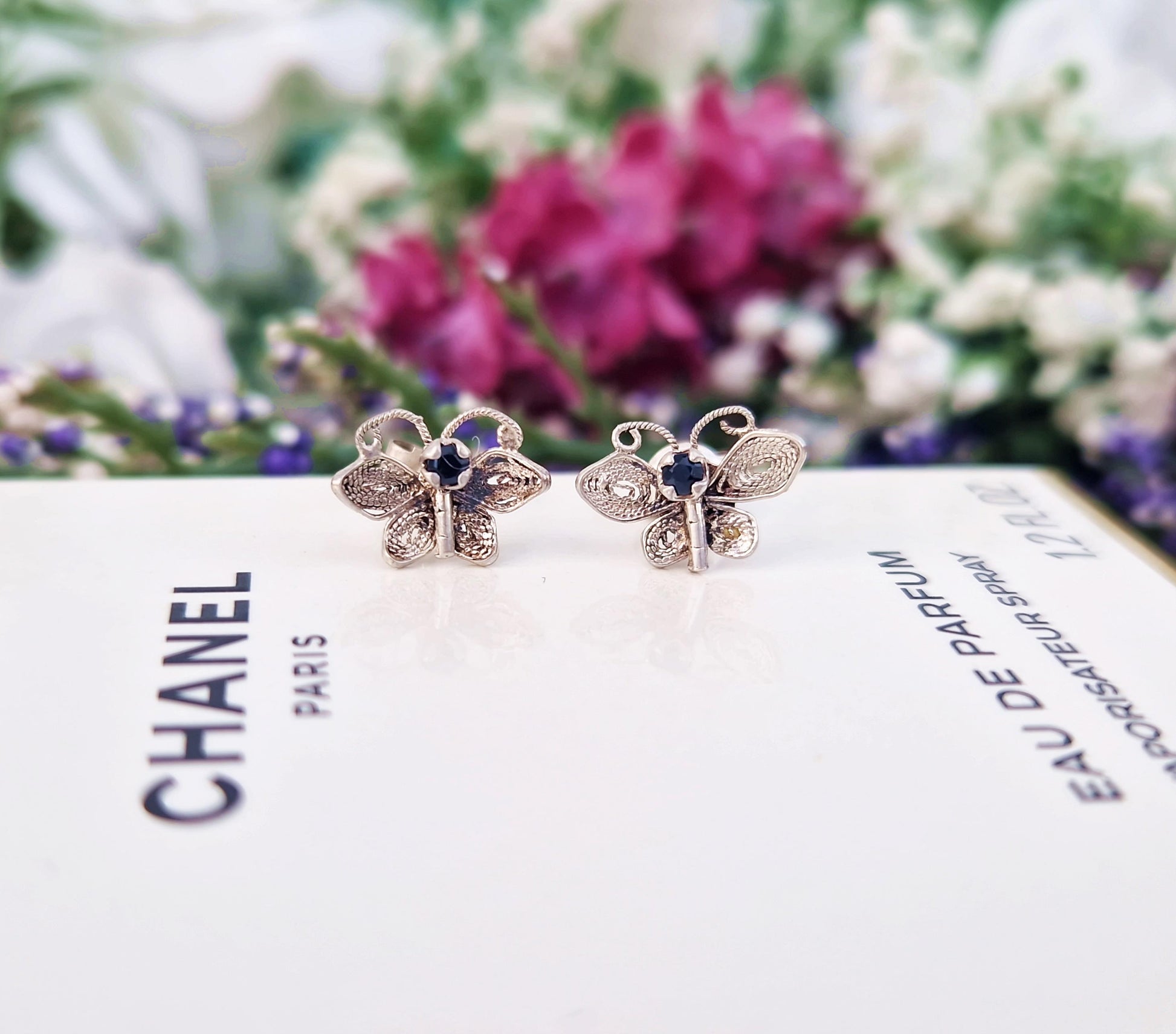 A set of two vintage pairs of stud earrings. One set depicts detailed 3D roses, and the other depict tiny ornate silver wire butterflies whoch have small blue sapphires set into them. These lovely earrings would be perfect stacked up together, or could be worn alone for a more subtle daytime look.