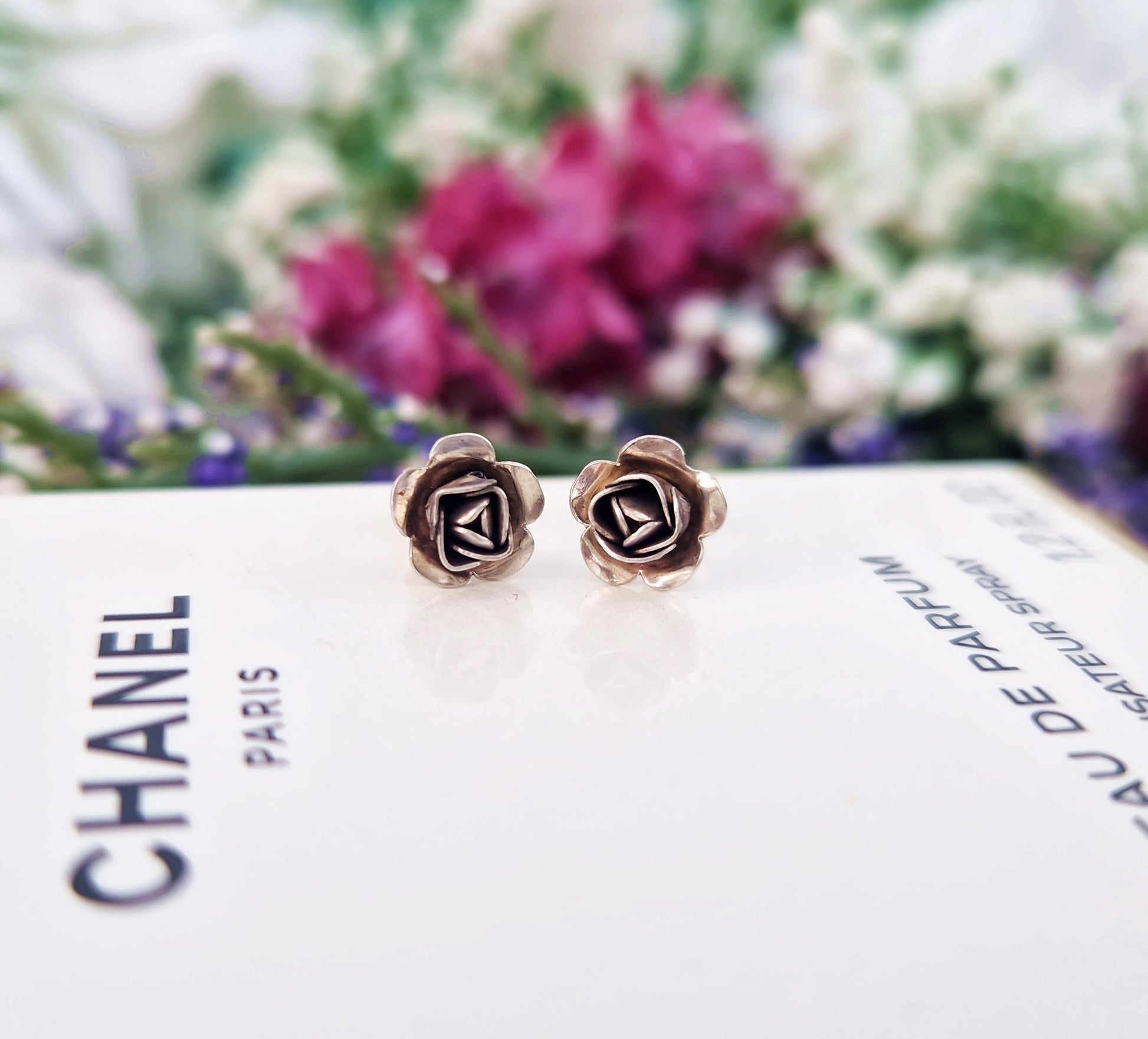 Set of 2 Vintage Sterling Silver Stud Drop Earrings - Roses and Butterflies