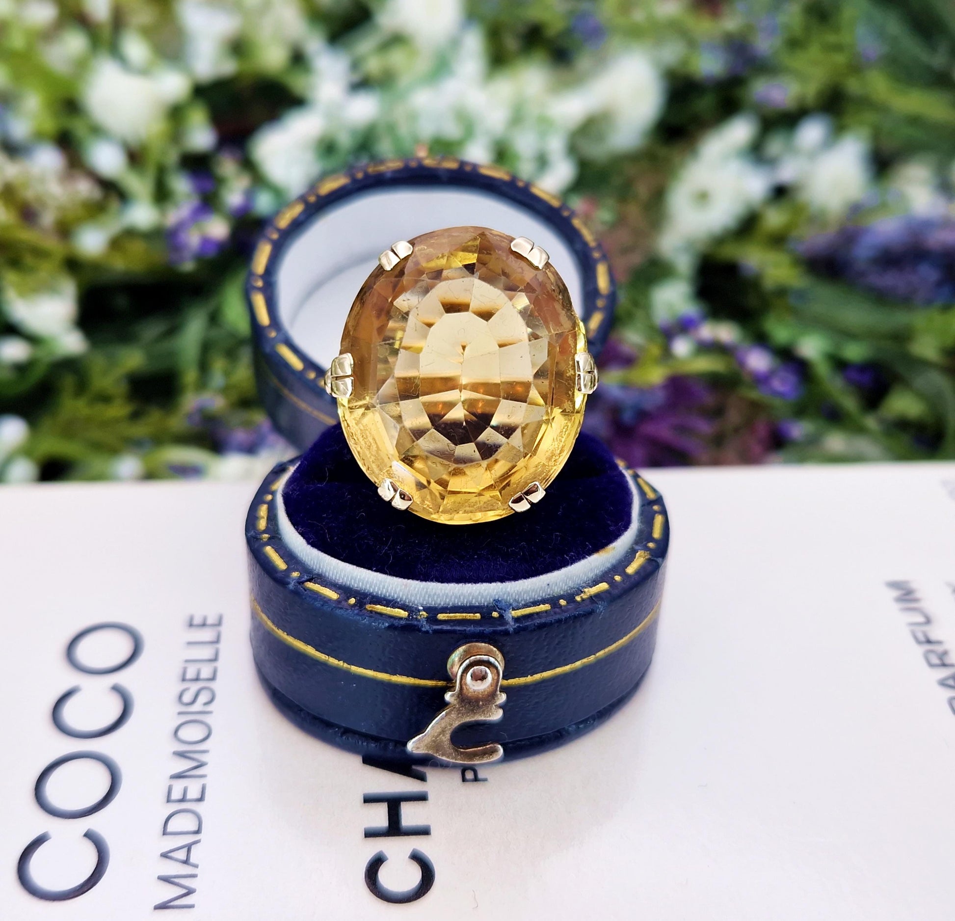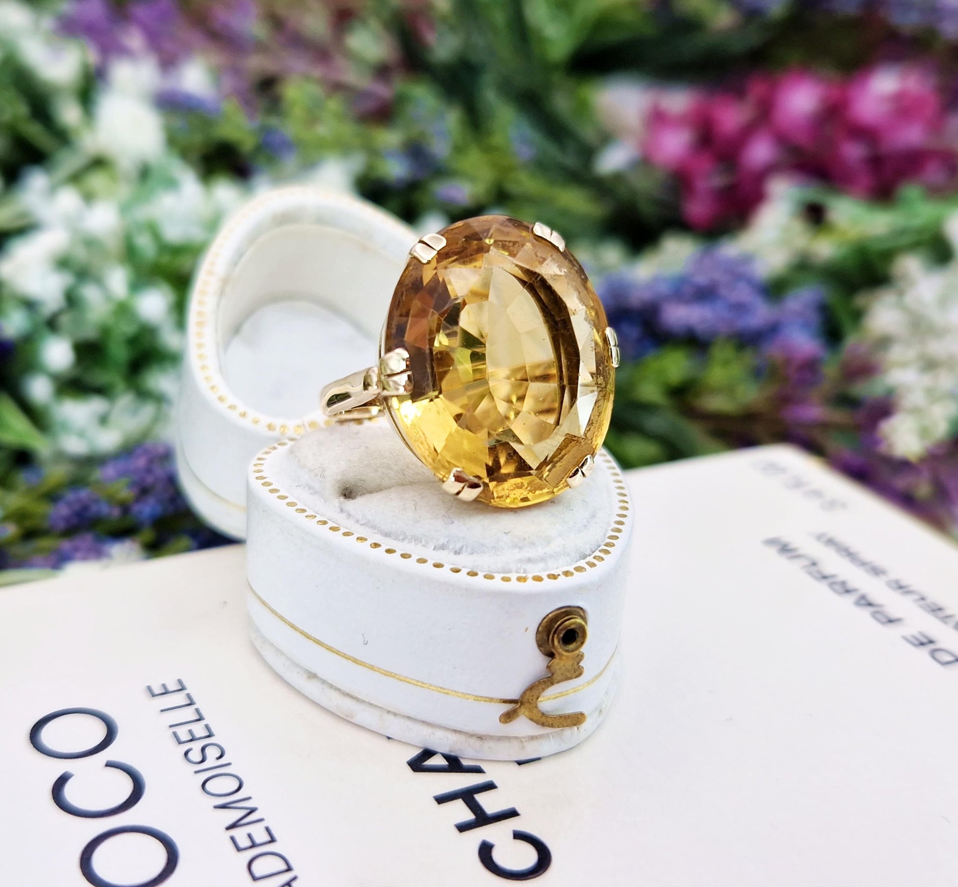 A beautiful solid 9ct gold vintage ring. This ring features a huge 10ct wide oval cut citrine gemstone - this citrine is a bright sunshine yellow in colour, it catches the light and throws rays of vibrance. It is set in a multi split-prong mount with a solidly constructed gallery and band that appropriately supports the weight of the gemstone. A stunning statement vintage gemstone ring. This ring was found locally in Scotland and it's possible it was made here, it could even be a Cairngorm citrine. This is one of the largest citrines we've ever come across!