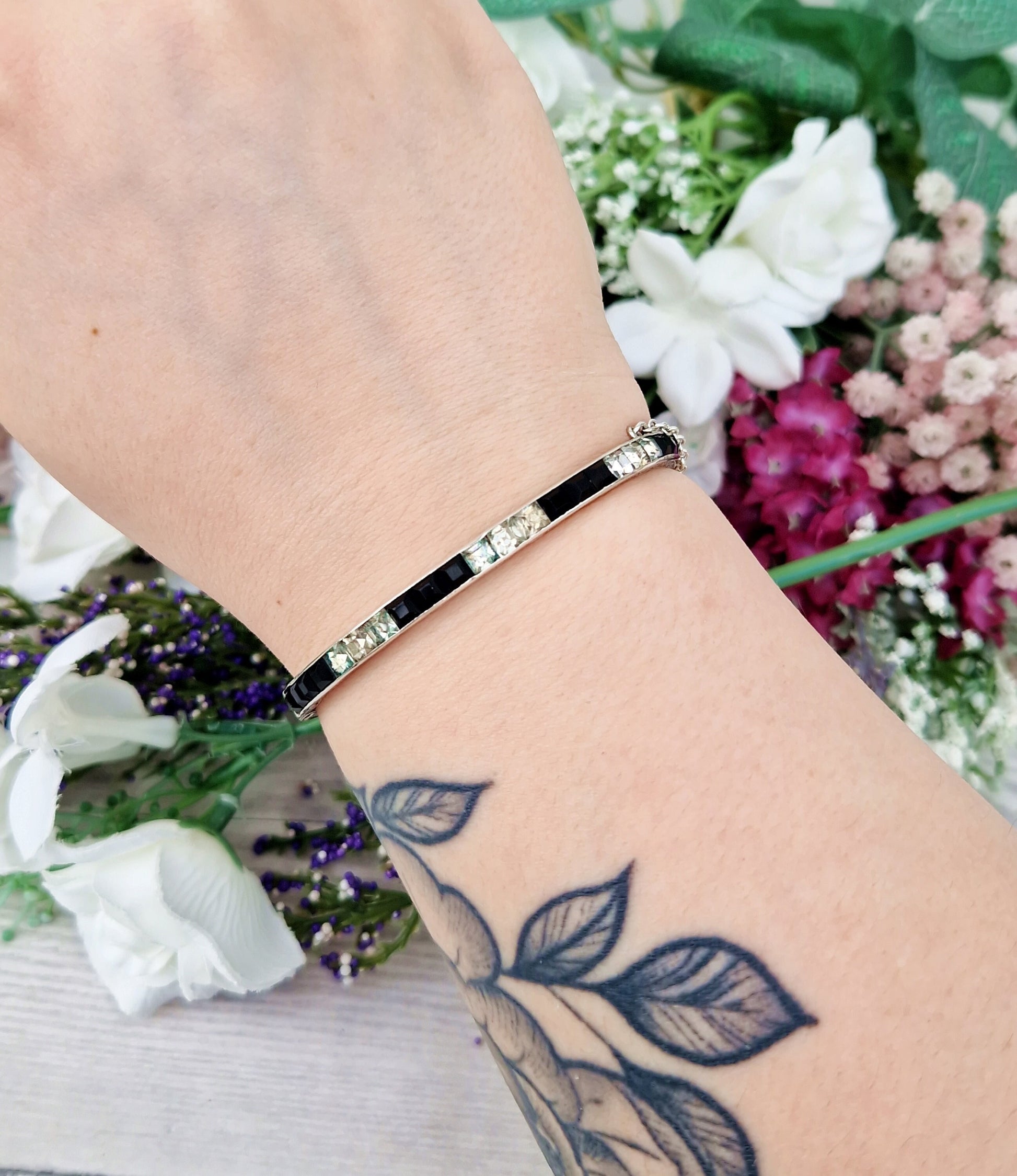A gorgeous true Art Deco era bangle bracelet, circa 1930. This bracelet is really excellent quality, is it made of solid sterling silver and has quality sparkly hand cut square paste glass stones. The glass sparkles beautifully and is a perfect monochrome mix of alternating black and clear. The foil backed glass stones are channel set with milgrain edge details, and the bangle is beautifully engraved with tiny flower patterns on the sides, there is so much fine attention to detail - this is truly spectacular work and so much love and care has been put into creating this piece of jewellery. The bangle is oval shaped for a comfortable fit to the wrist, it fastens with a click in clasp and is completed by a secure safetly chain for added peace of mind when wearing.