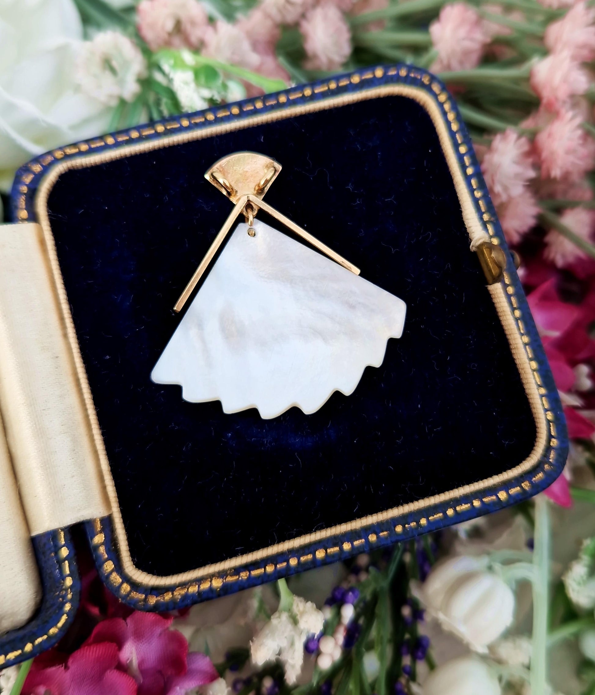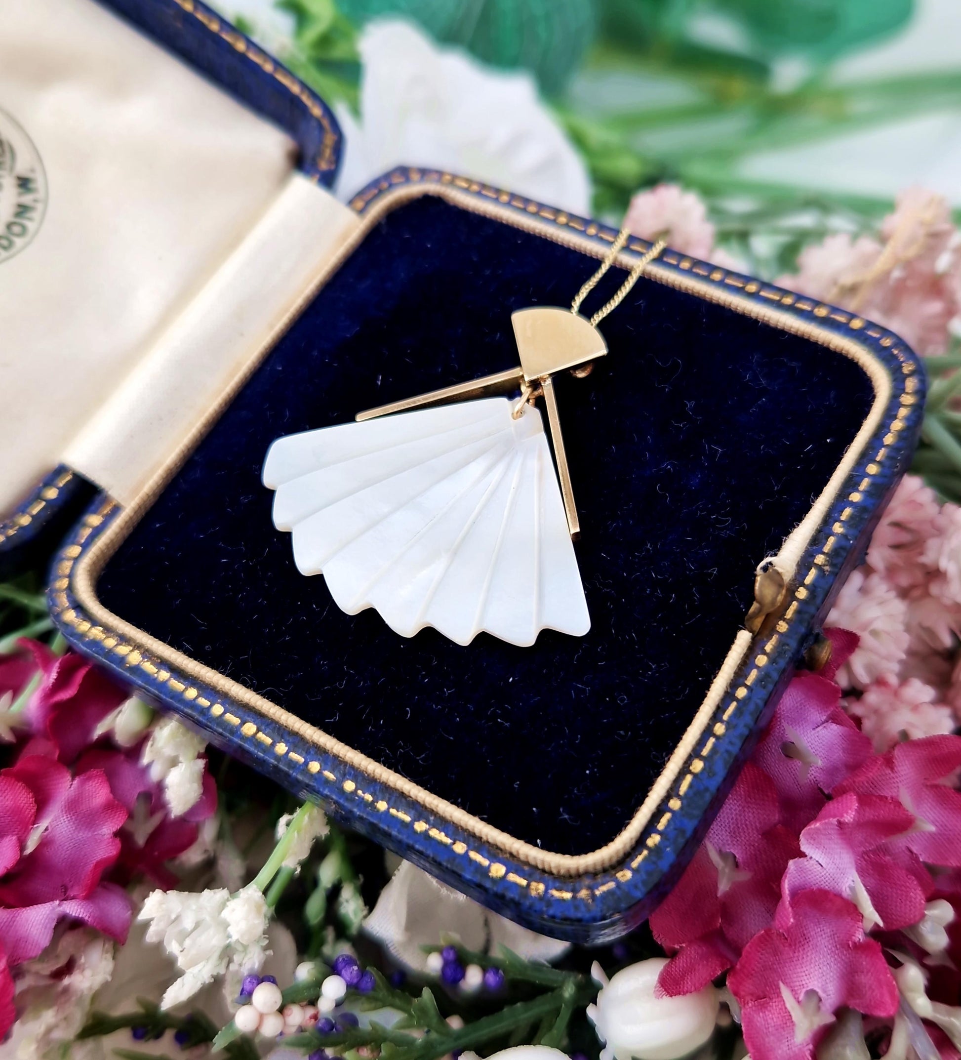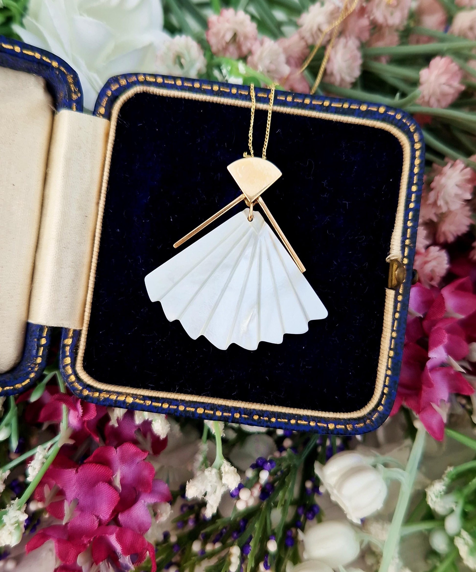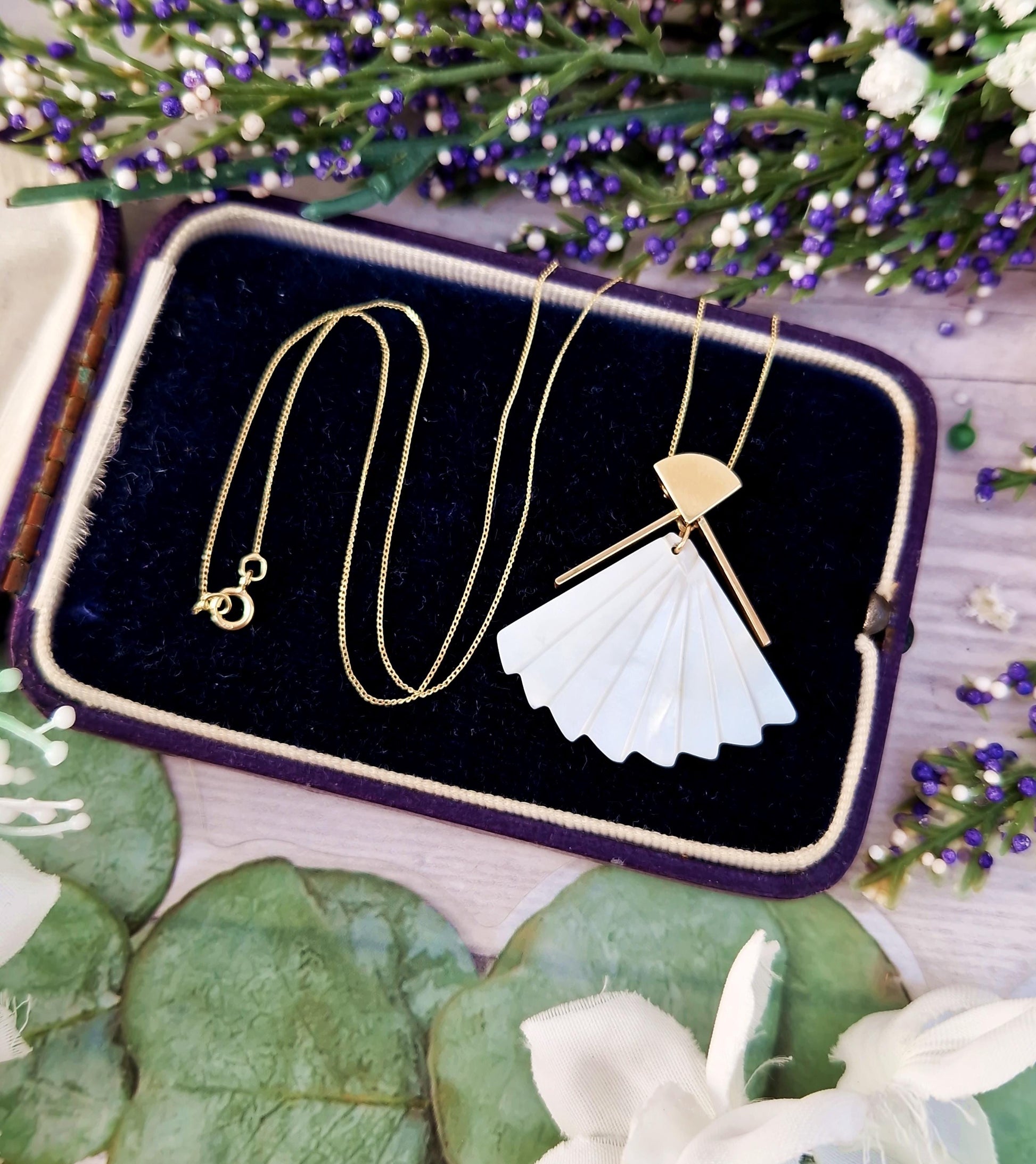 Vintage Art Deco Style 9ct Yellow Gold Mother of Pearl Fan Shaped Pendant Necklace