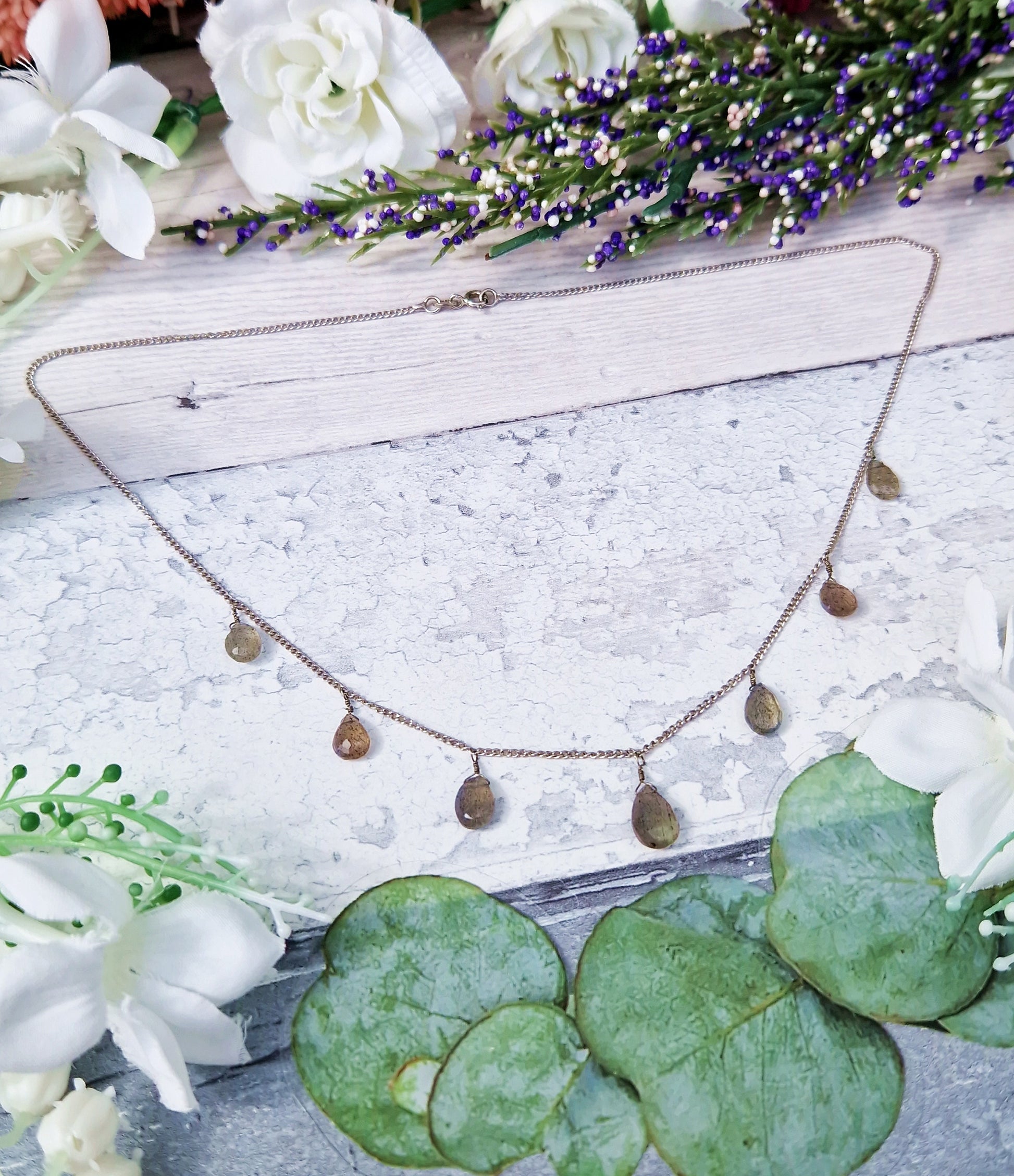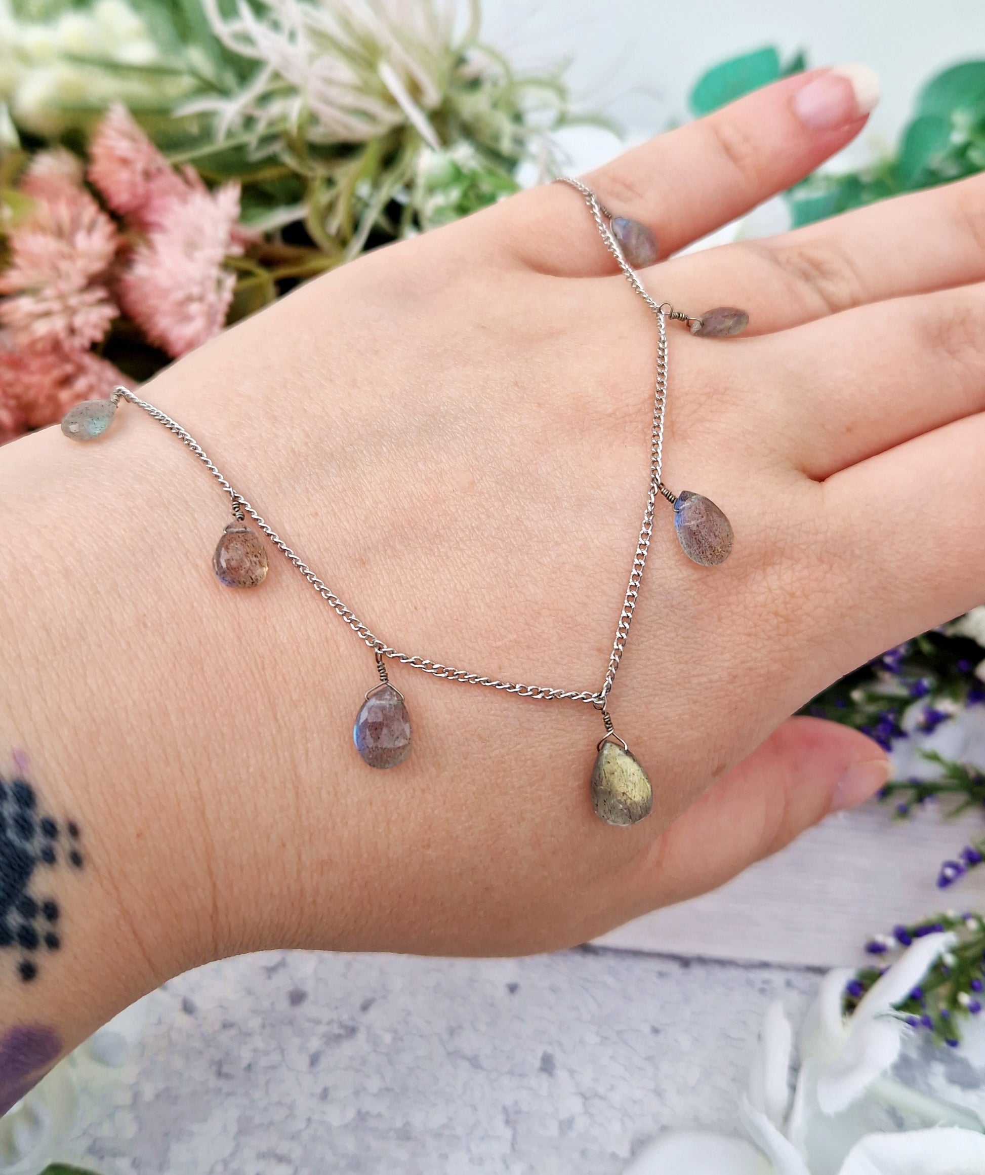 A sterling silver necklace, a lovely dainty fringe style, featuring a classic fine curb chain with holds 7 small teardrop shaped faceted labradorite gemstones. These gemstones are primarily tones of grey, and some flash with a blue adularescence (labradorescence), they all have natural noise and inclusoons. A lovely and easy to wear chain, ideal for daily wear, layering or necklace stacking. A very attractive Art Deco style find.