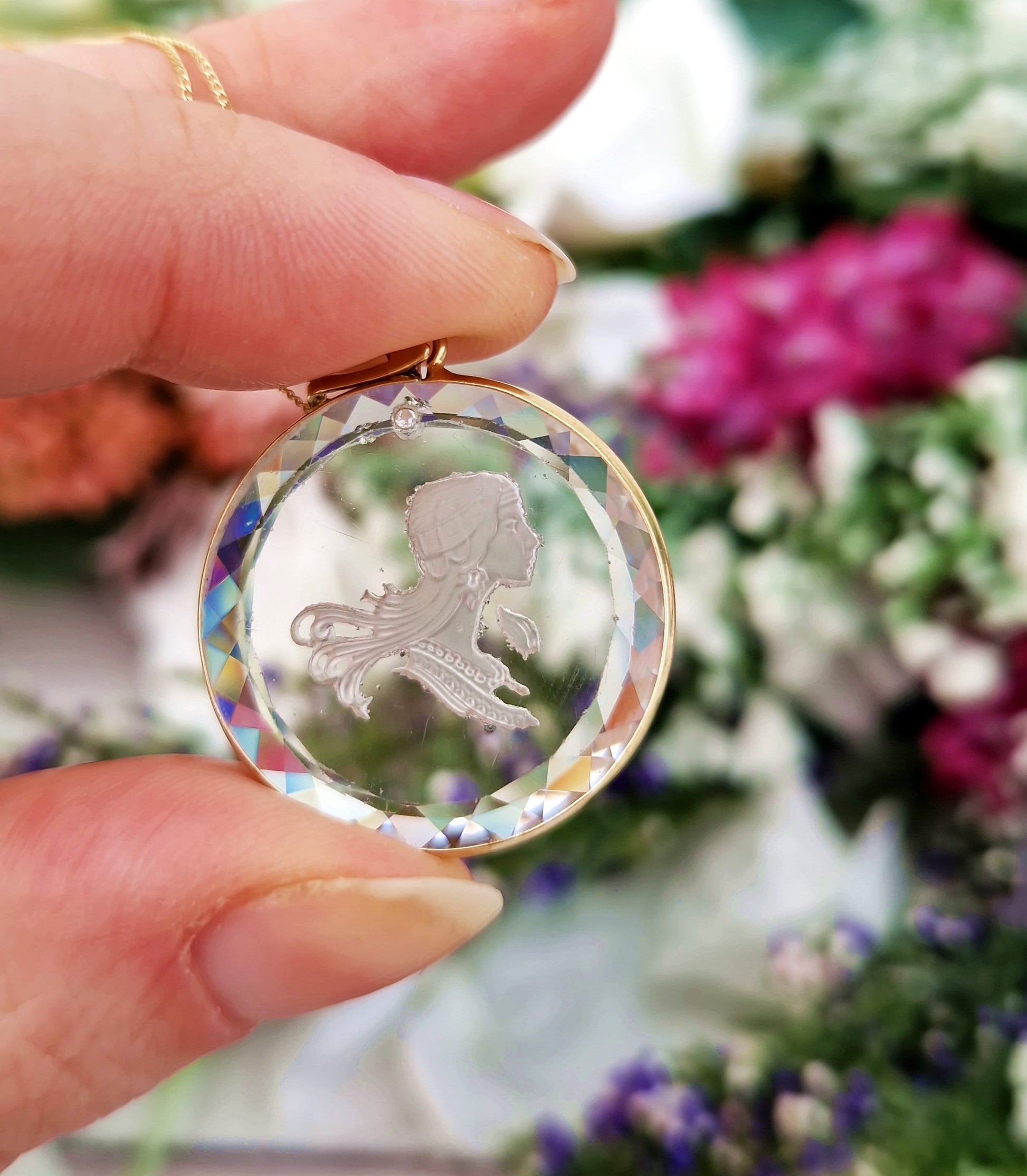 A gorgeous 9ct gold and glass panel pendant necklace. This amazing pendant is a true Art Nouveau style. The pendant has a gold frame which securely holds a clear panel of crystal glass with faceted edges. Carved in the reverse of the glass, is a beautiful maiden / lady with long flowing hair. The glass has faceted details to the edges wich sparkle and cast rainbows when the sun hits it. This is a beautiful play on a classic cameo / intaglio design. There are even two tiny sparkly crystals set into the glass, one on each side of the pendant, underneath the bail loop.