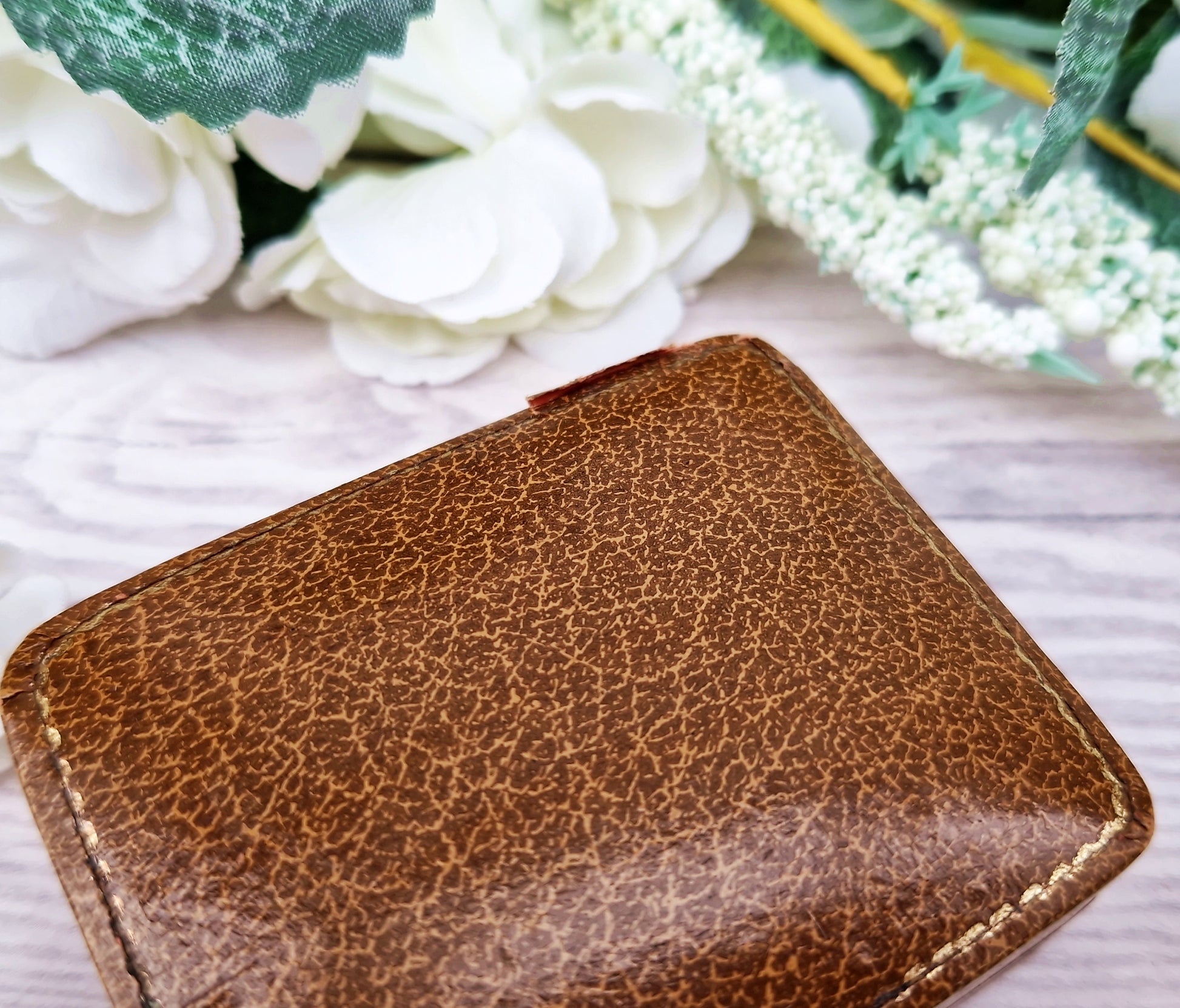 This lovely vintage jewellery box is hard shell and solid in construction, with a mottled medium brown exterior, with a dainty gold trim around the lid. The inside of the box has a plush dark purple pad with silky cream lid lining. Suitable for most pendants, necklaces, small brooches or dainty bracelets. Opens by pressing the small button.
