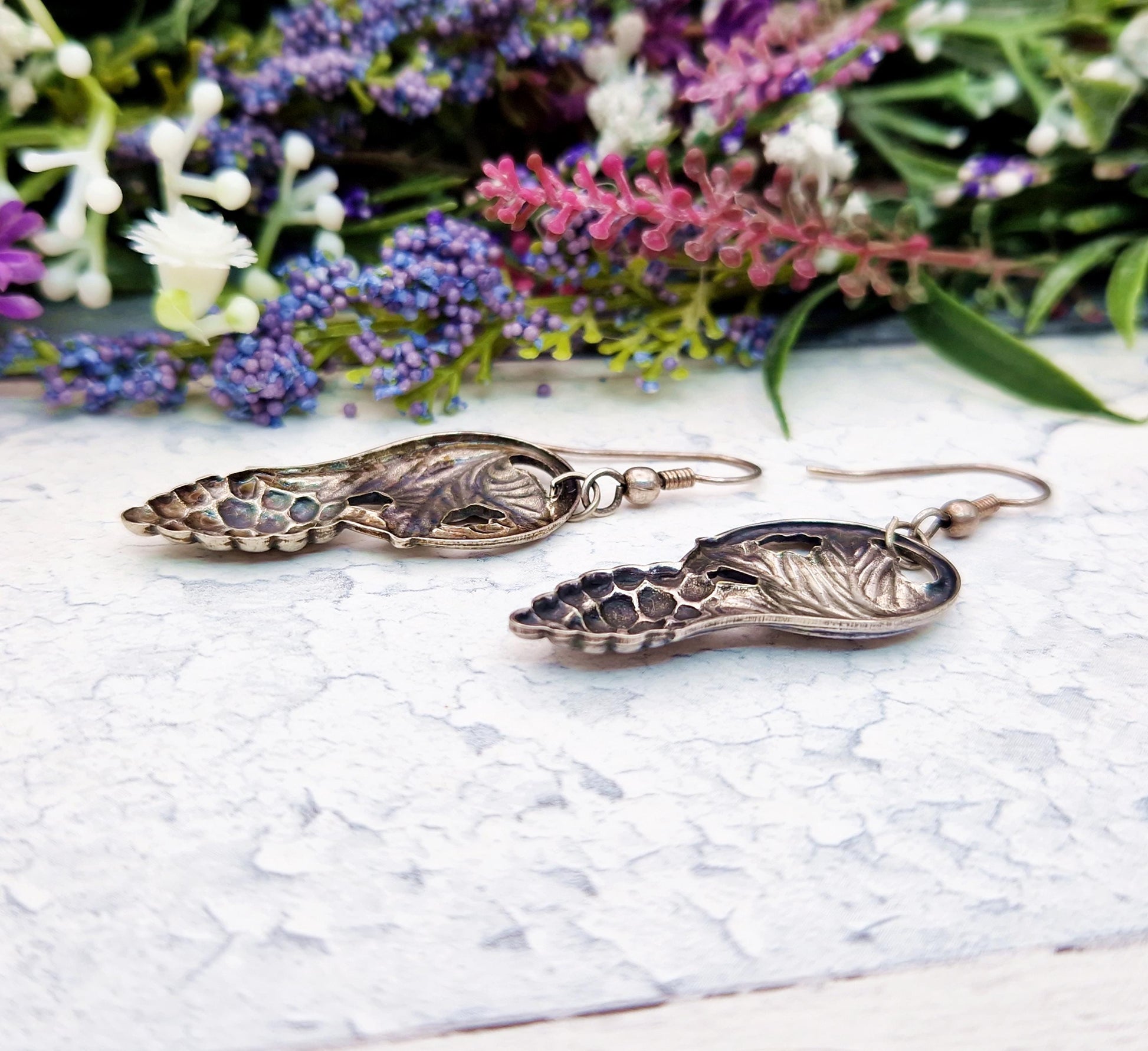 A beautiful pair of silver tone metal vintage Art Nouveau style earrings, made around the mid-century. A hook style, for pierced ears.. A French repousse design that depicting leaves and berries, to me they look like blackberries, but I might be wrong!