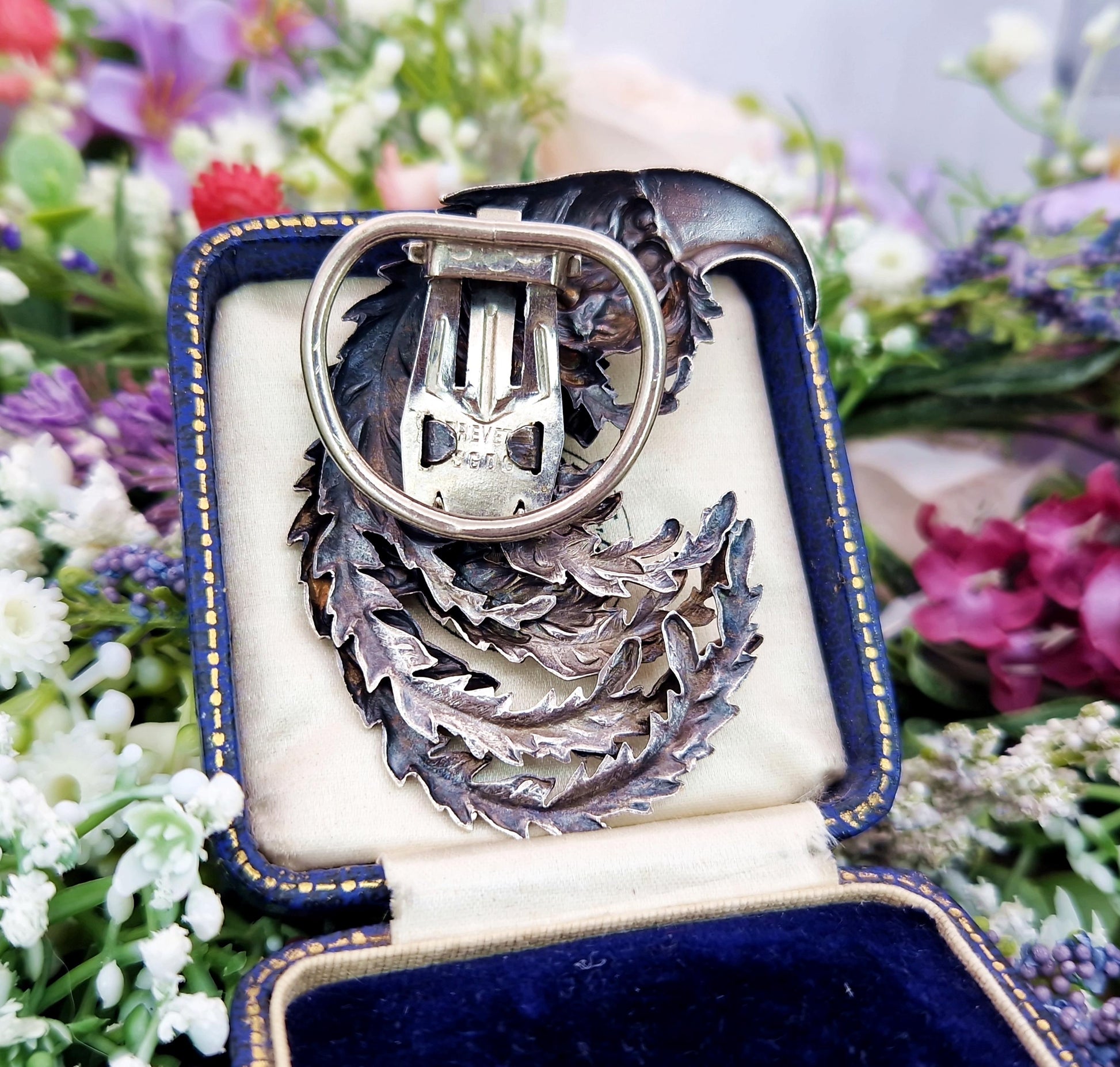 This is a striking, large and highly detailed, vintage scarf clip. This clip is been designed in high relief to resemble two feathered talons or claws. Presumably suggesting a beloning to a griffon, eagle, gargoyle or other fantasy creature with strong claws and feathered details. A statement piece that will look amazing on your scarf - it could be worn as cosplay or to a renfaire - or absolutely worn by a fantasy fan on a daily basis. The design is very Art Nouveau in style, but it's like this clipwas made in the mid century.