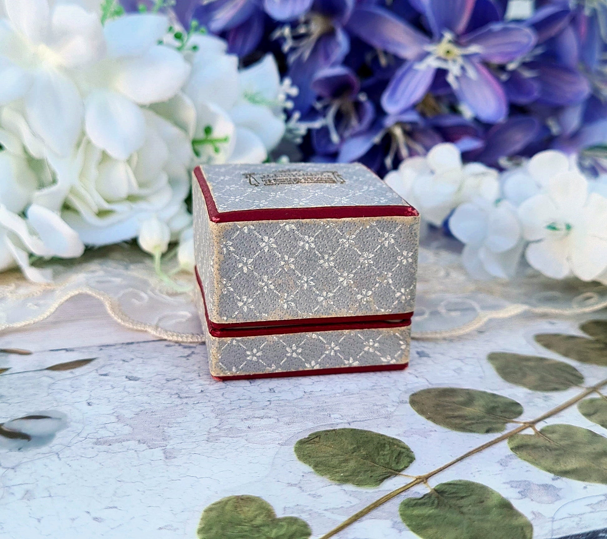 A lovely vintage ring box. This lovely vintage ring box is made of strong card, it has a light grey exterior with red trim and a white daisy print, and a crimson red interior plush ring pad. The lid is stamped in gold with the details 'H. Purchen Watchmaker and Jeweller. 168 North End, Cryodon'. There are a few further address details that are hard to make out. It measures 3.8 x 3.8 x 3.2 cms in size when closed.